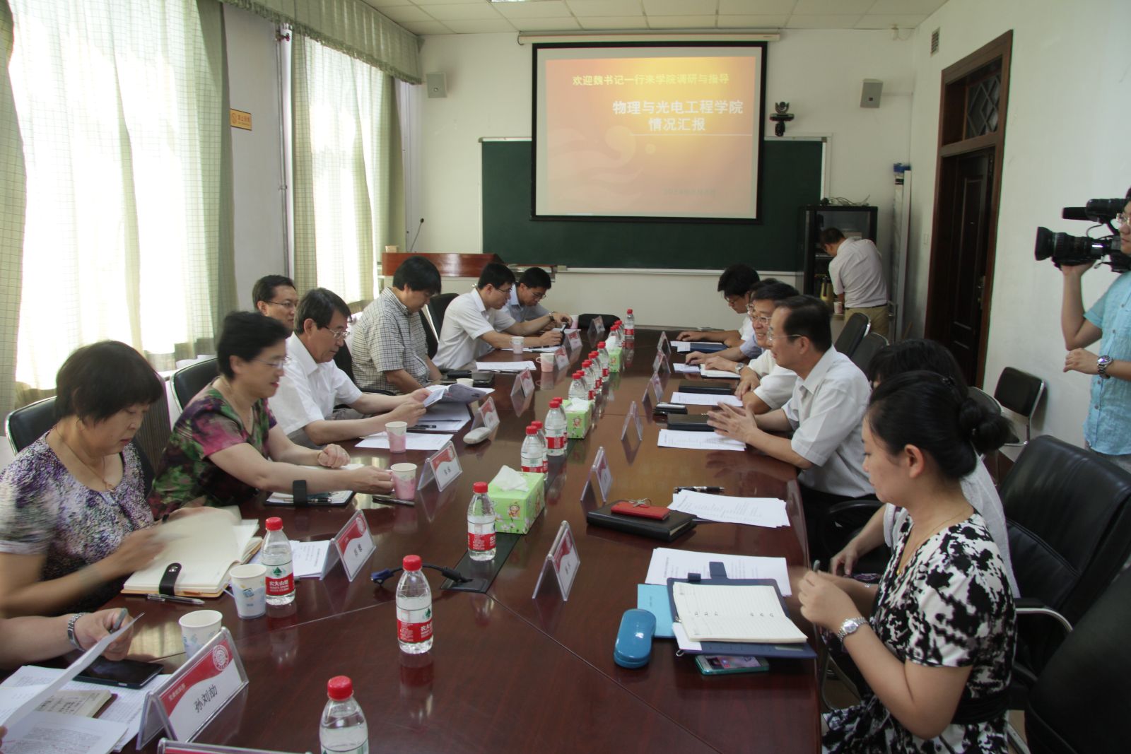8月8日上午,学校党委书记魏小鹏在物理与光电工程学院系楼425会议室,调研物理学院工作。学校办公室主任宋丹、科研院院长宋永臣、教务处处长朱泓、研究生院副院长郭驰、发展规划处处长姚化成、组织部副部长孙刘劼、人事处副处长韩敏、校办秘书科科长苏克治陪同走访。学院党政领导班子成员赵明山、刘金远、周玲、丁洪斌、常亮、杨木出席会议。