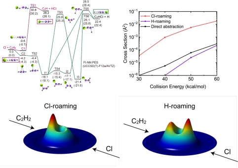 长期以来,经传统过渡态结构的直接抽取路径一直以来被认为是化学反应过程中所遵循的主要机制。尽管在越来越多的单分子解离体系和双分子碰撞反应中都发现了有别于该传统最小能量路径的漫游机制,但漫游机制在反应过程中的占比并不明显。在本研究中,研究人员通过构建高精度全维基态势能面,对Cl + C2H2 → HCl + C2H反应进行了可靠的动力学计算工作。研究结果表明,在该碰撞反应中存在氯漫游(Cl-roaming)和氢漫游(H-roaming)两种反应机制。在Cl-roaming机制中,入射的Cl原子与乙炔分子碰撞后会形成C2H2Cl络合物中间体,随后Cl原子从络合物中部分解离并在乙炔分子附近漫游,最终抽取其上H原子形成HCl。而在H-roaming机制中,H原子率先从形成的络合物中间体中脱离,并在络合物附近迁移漫游,进而从中提取Cl原子生成产物。通过进一步分析其动力学计算结果,研究发现漫游机制在该吸热反应中的贡献几乎为100%,直接抽取路径与之相比几乎可以忽略不计。这些发现挑战了传统过渡态理论对双分子反应的认知,强调了在反应动力学研究中考虑非传统路径对精确预测速率常数和深入理解反应机理的重要性。