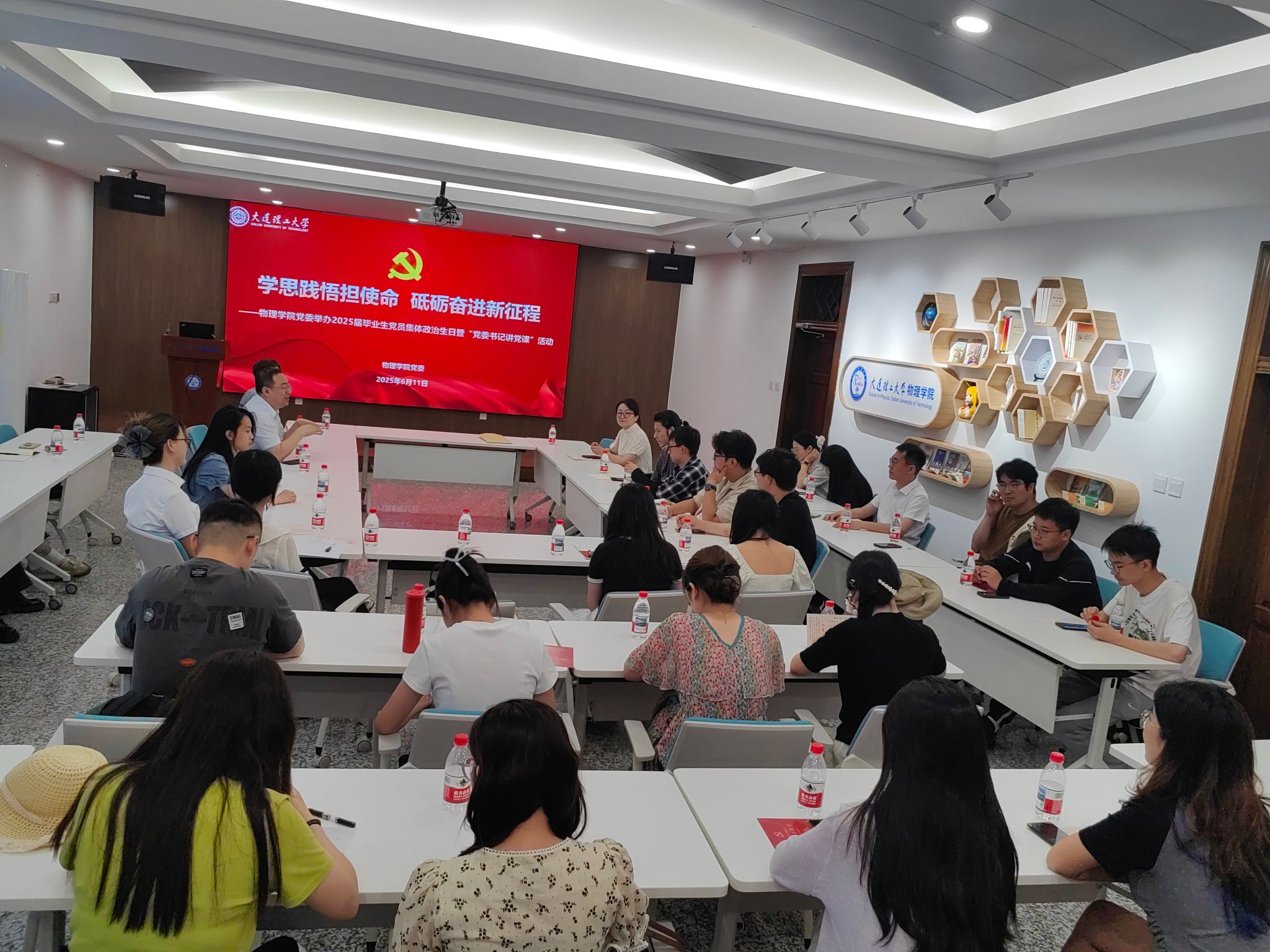 为切实加强毕业生党员教育管理,引导其深学笃行习近平新时代中国特色社会主义思想,坚定理想信念,担当时代使命,物理学院党委于2025年6月11日下午在物理楼322室举办2025届毕业生党员集体政治生日暨“党委书记讲党课”活动。活动由学院党委副书记兼纪委书记于艳敏同志主持,学院党委书记于长水、党委副书记兼副院长周福良、党委组织员纪丹红、学生工作办公室主任张弛及2025届毕业生党员参会。