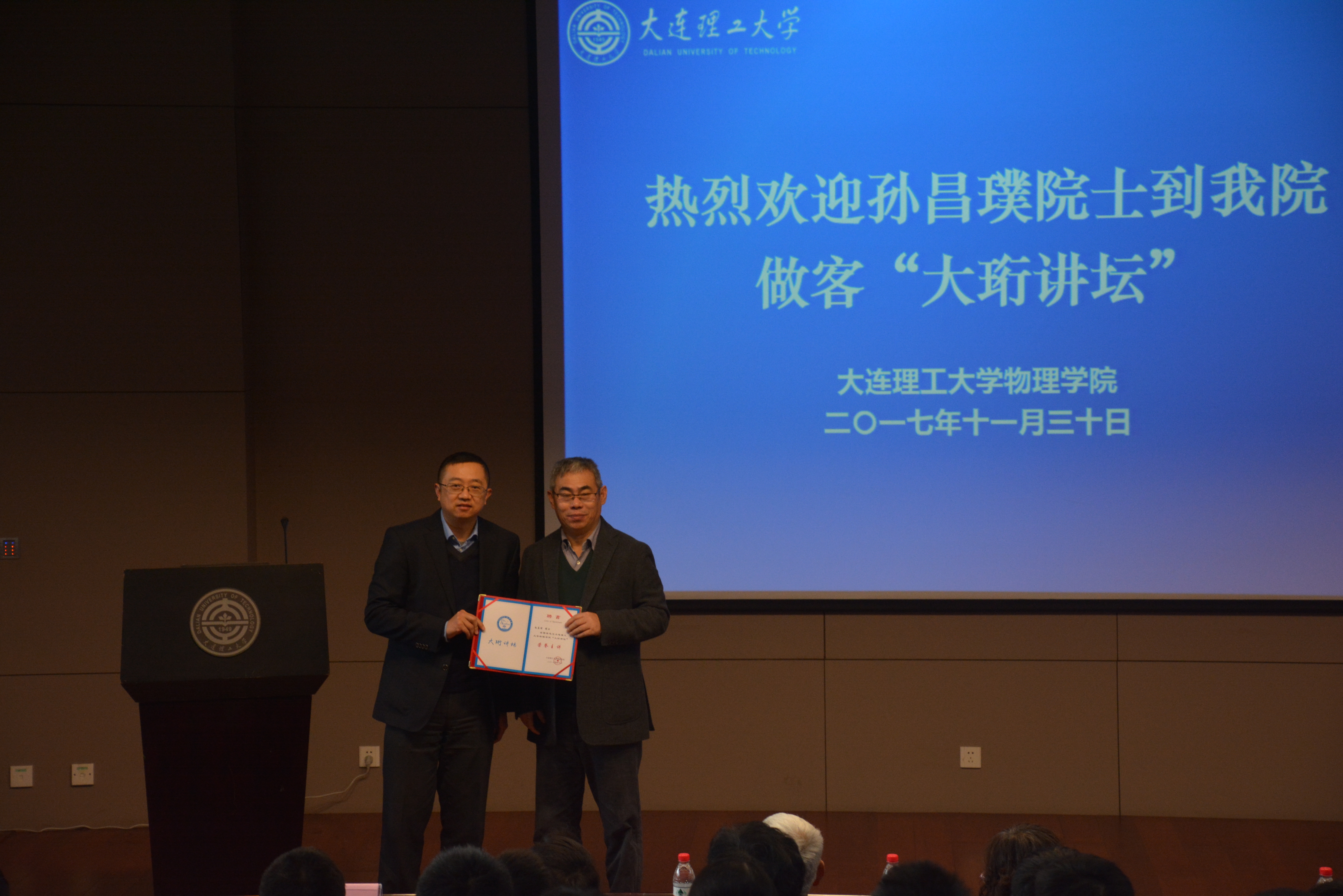 在讲座开始前,物理学院赵纪军院长向孙昌璞院士颁发“大珩讲坛”荣誉主讲聘书。