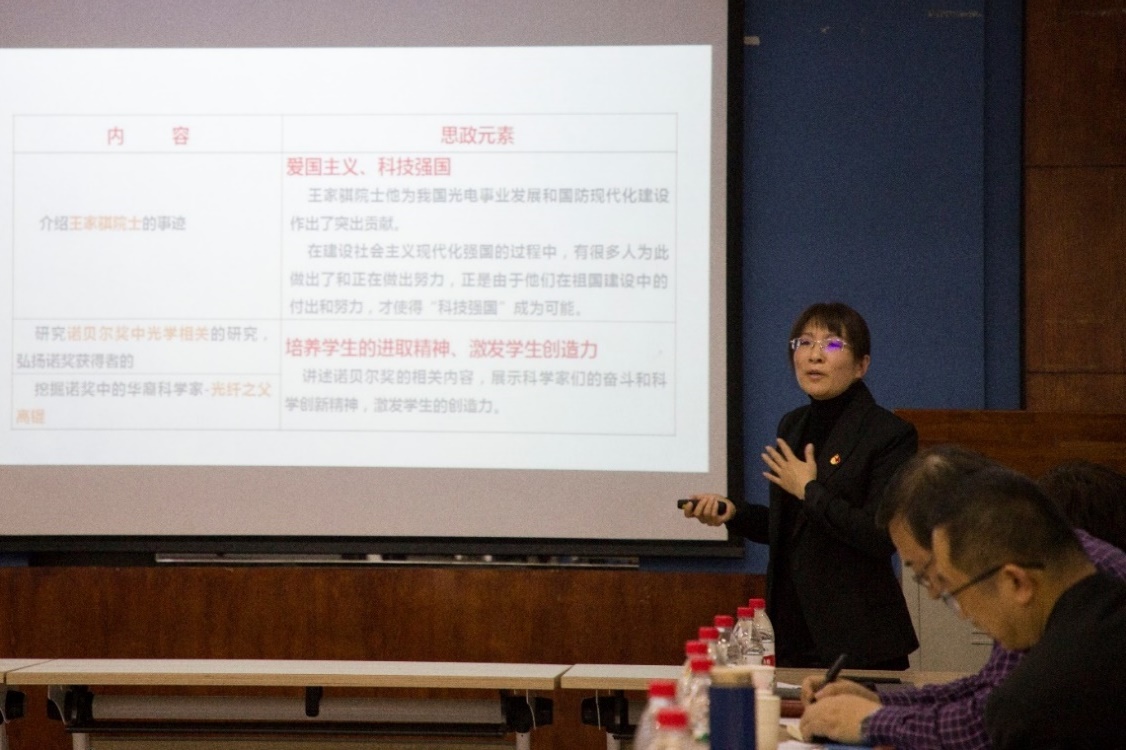 研讨会邀请到教育部高等学校物理学类专业教学指导委员会专家、东北师范大学物理学院党委书记李金环做主旨报告《依托学科的光学课程群“课程思政”建设探索》。李金环阐述了个人对课程思政的认识,介绍了东北师范大学在课程思政建设方面的探索举措,展示了东北师范大学“手拉手团队”对普通物理课程中思政元素的梳理成果,并指出:课程育人是“三全育人”最重要的组成部分,课程思政建设将以评价方式创新为突破口,倒逼教学模式改革。