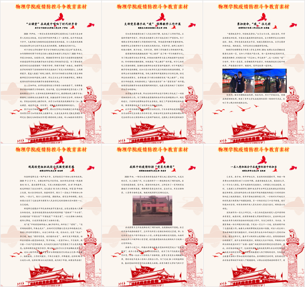 疫情防控斗争已持续半年,物理学院党委在各项工作中坚决落实主体责任,坚持两个“牢牢把握”,确保学院疫情防控工作不折不扣地落到实处:共面向151名在职教职工、81名离退休教师、412名本科生、395名研究生做好管理服务工作;共计提交500余份疫情报告(报表),处理200余人次进校申请、为不能到校的师生制作80余份扫描材料、解决疫情期间师生的实际困难10余项。在建党99周年之际,物理学院党委将继续带领师生党员不忘初心、牢记使命,坚决打赢疫情防控阻击战。