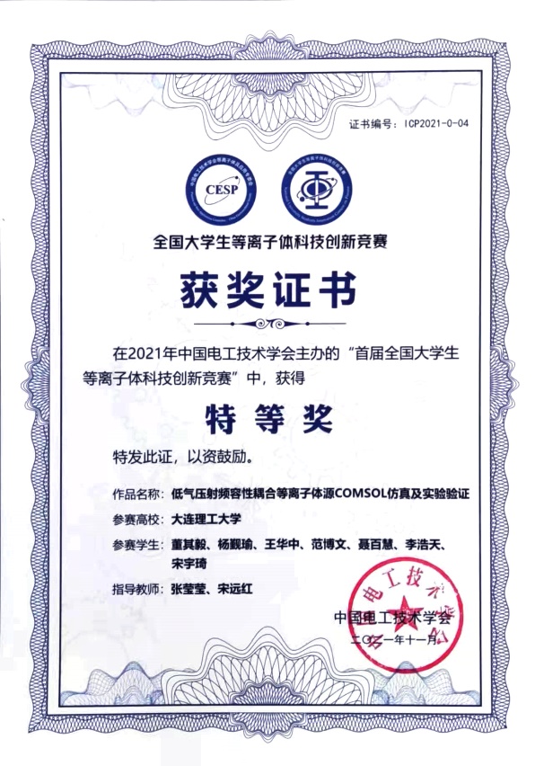 2021年12月12日,由中国电工技术学会主办,河海大学、南京工业大学共同承办的首届全国大学生等离子体科技创新竞赛落下帷幕,大连理工大学参赛队伍获得竞赛特等奖1项、一等奖2项、二等奖3项、三等奖5项,同时我校获优秀组织单位奖。其中,物理学院本科生董其毅等同学共同完成的作品《低气压射频容性耦合等离子体源COMSOL仿真及实验验证》(指导教师:张莹莹、宋远红)荣获特等奖。