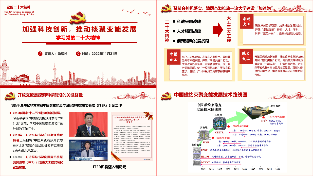 11月21日,物理学院党委落实学校党委部署,推进学院学习贯彻落实党的二十大精神“奋进新征程”系列活动,邀请学校学习贯彻党的二十大精神师生宣讲团成员、物理学院等离子体物理教工党支部书记桑超峰教授,为学院全体师生党员作《加强科技创新 推动核聚变能发展》专题报告。