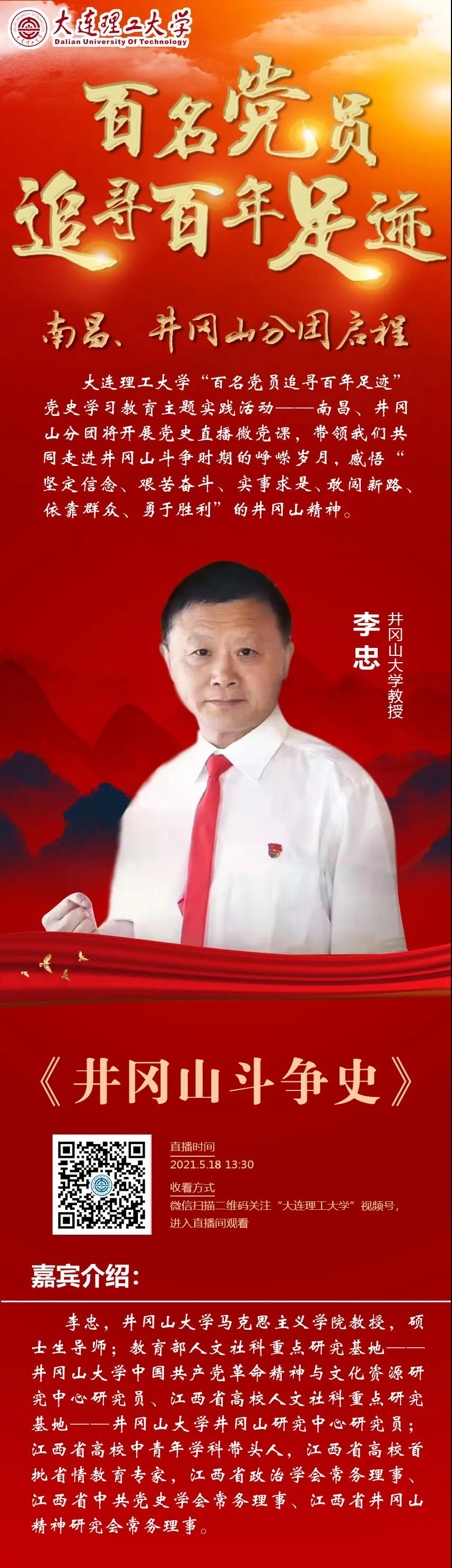 课程背景:大连理工大学“百名党员追寻百年足迹”主题实践活动共成立10支实践团,陆续赴全国各地开展党史学习实践。本期课程由南昌、井冈山分团邀请进行,通过直播开展现场教学。