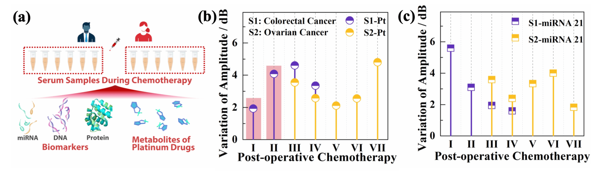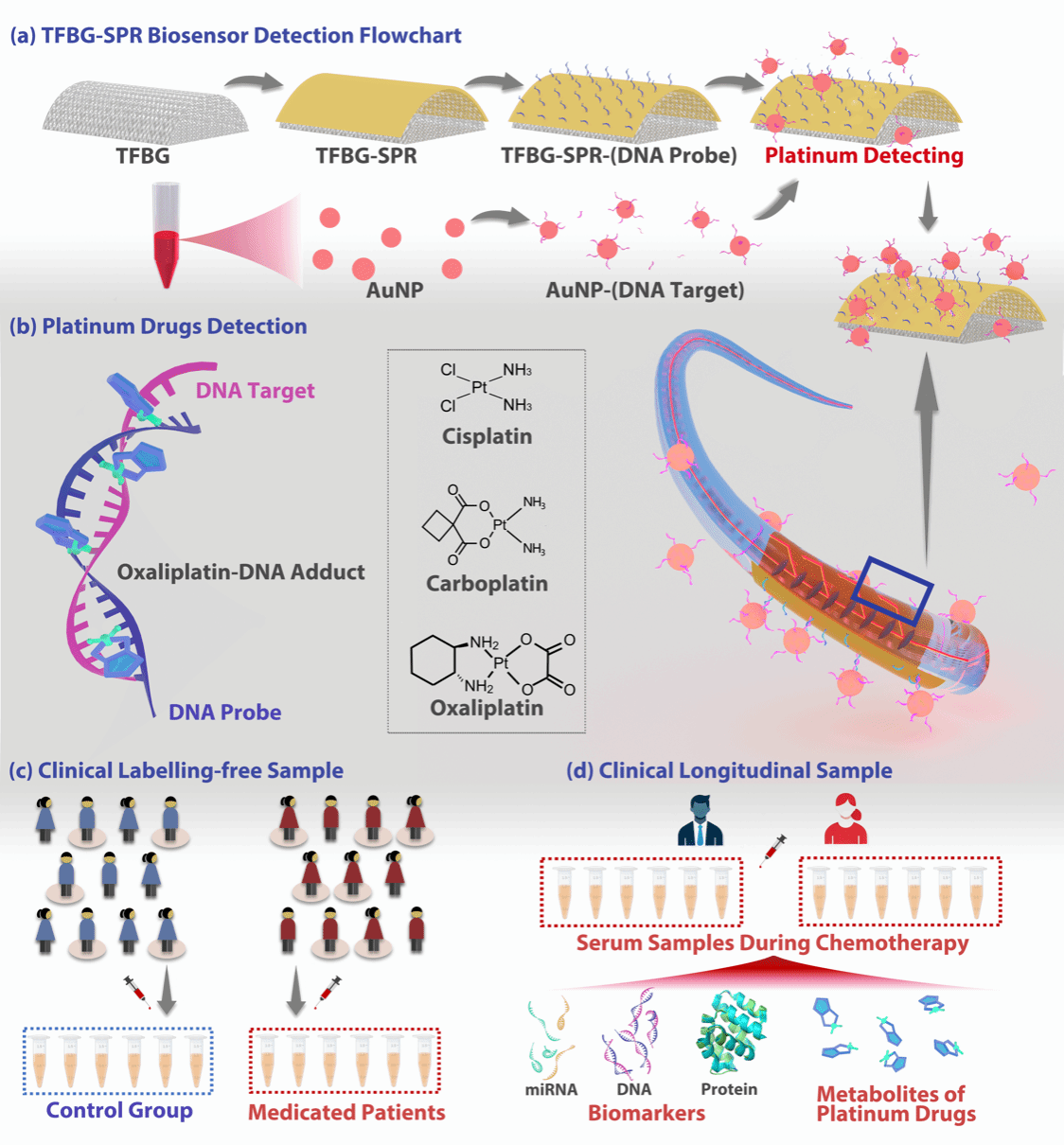 多宝网投先进光学与光纤传感彭伟教授课题组与大连理工大学附属肿瘤医院(辽宁省肿瘤医院)检测科、神经外科、妇科展开深度合作,以倾斜光纤布拉格光栅表面等离子共振 (TFBG -SPR) 技术的光纤传感元件为核心,结合DNA靶向捕获探针,实现了临床铂类化疗物的高特异性、超痕量POCT检测,为化疗过程中铂药的药代动力学分析提供了有效方案;另外同步开展癌症标志性核酸序列miRNA-21的多组学分析,最终服务于精准化疗的、管理与个体化治疗决策提供动态数据,并首次通过POCT临床快检平台技术发现了铂药和miRNA在预后化疗周期的负相关性。该成果以“Plasmonic Fiber Optic Sensing Platform for Point-of-Care Pharmacokinetic Monitoring of Platinum Chemotherapeutics: Toward Ultra-trace Multi-Omics Precision Chemotherapy Management”为题发表于ACS Sensors,第一作者为多宝网投博士研究生段怡凡,通讯作者为多宝网投张扬副教授、辽宁省肿瘤医院检测科主任郑阳医生以及结直肠科李永民医生。