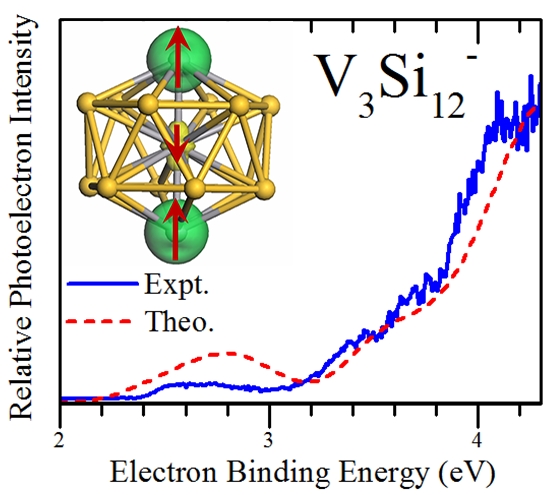 该研究运用基于第一性原理的遗传算法全局搜索,结合光电子谱实验,研究了一个到三个V原子掺杂Si12团簇的结构和性质,发现V3Si12负离子团簇具有车轮状的双帽反六棱柱结构,并表现出有趣的亚铁磁性,总磁矩为4 μB。在此基础上,还可以构造V-Si的一维亚铁磁性纳米线,有望作为未来纳米自旋电子学器件的构造单元。本研究得到了国家自然科学基金的资助。