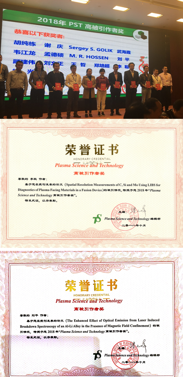丁洪斌课题组此次获奖的两篇论文题目分别为“Spatial Resolution Measurements of C, Si and Mo Using LIBS for Diagnostics of Plasma Facing Materials in a Fusion Device”和“The Enhanced Effect of Optical Emission from Laser Induced Breakdown Spectroscopy of an Al-Li Alloy in the Presence of Magnetic Field Confinement”。两篇论文聚焦于激光诱导击穿光谱技术(LIBS)应用于大型等离子体托卡马克聚变装置的重大需求,分别针对第一壁元素空间分辨探测以及全超导托卡马克磁场环境影响开展研究。文章发表以来,得到了国内外同行的广泛关注和高度认可,下载量和引用量均在同期《Plasma Science and Technology》论文中名列前茅。