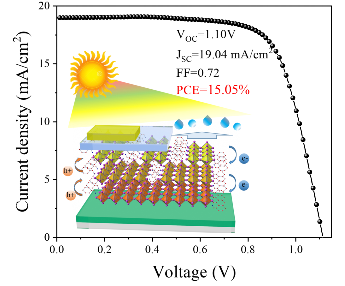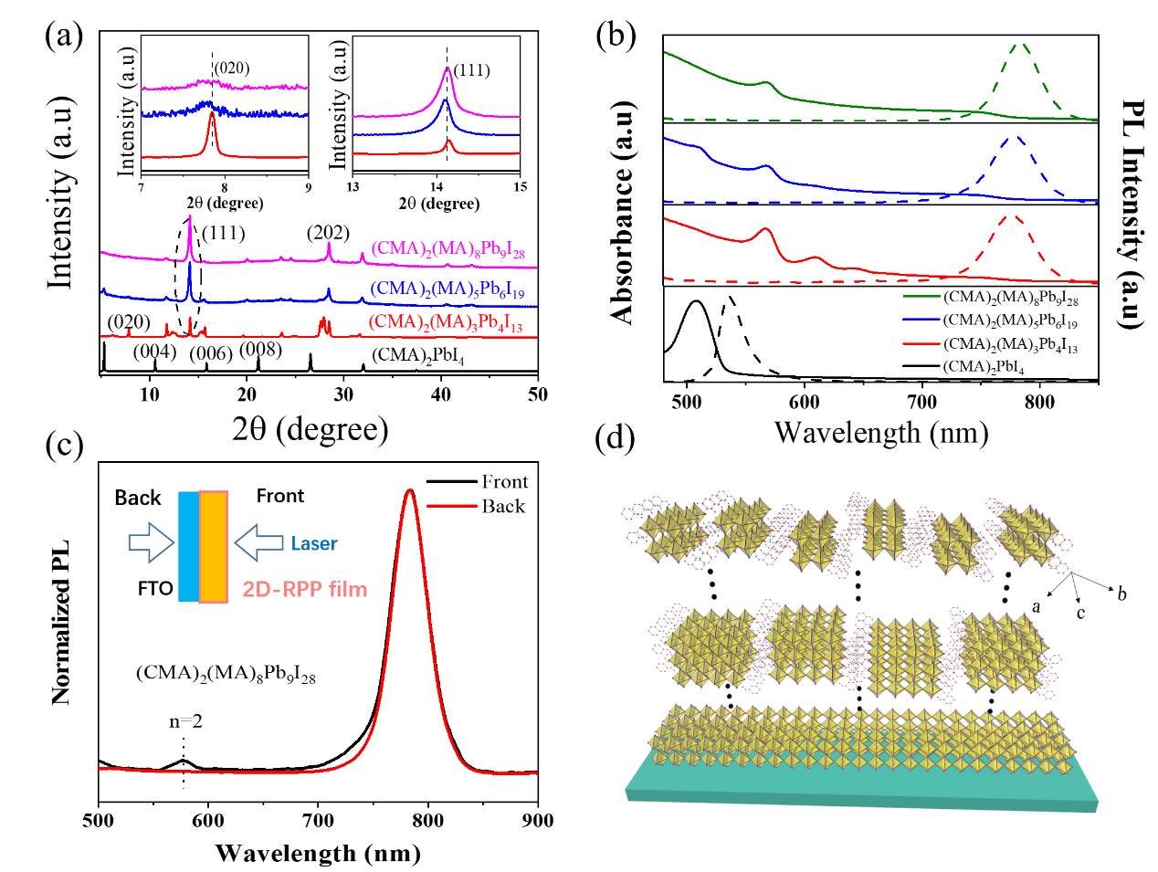 本研究中所制备的2D-RPPs结构为(CMA)2(MA)n-1PbnI3n + 1(MA为CH3NH3 +,CMA 为C6H11CH2NH3 +,n = 1,2,3 ......),采用环己甲胺(CMA)为间隔阳离子。与先前报道的RPP不同,这种新钙钛矿材料的沉积膜表现出反向量子阱(QW)分布的多个相:即小n值的相主要分布在薄膜表面而大n值相集中在薄膜底部。这种分布结构具有以下三个优点:(1)分布在表面具有更强抗湿性的小n值成分可作为屏障,保护脆弱的大n值成分免受水分子的侵蚀;(b)不同相之间组成了第二型能级排布,有利于自驱动电荷的传输;(c)独特的阶梯状量子阱分布拓宽了光子吸收范围,尤其增强了短波处的吸收。由于这些特性,基于环己甲胺的正式平面二维钙钛矿太阳能电池取得了1.10 V的高开路电压,达到了15.05%的能量转换效率。迄今为止,这一结果是已报道的具有正式结构的甲胺系(MA)二维钙钛矿太阳能电池中的最高效率。