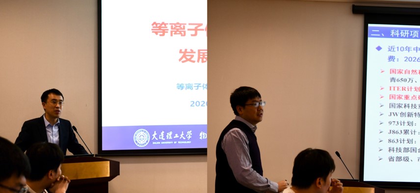 会议第二部分为各研究团队的科研进展汇报,刘永新教授、桑超峰教授、李聪副教授、王丰副教授、刘景林博士、宋健博士和梅显秀教授,分别代表各自团队进行了团队研究方向、研究队伍、承担项目、代表成果和未来发展规划报告。中心的研究方向涵盖低温等离子体放电模拟与实验、磁约束核聚变边界等离子体及器壁相互作用、托卡马克第一壁实验诊断、先进激光光谱诊断、磁约束核聚变磁流体和高能量粒子、大气压等离子体放电实验与模拟、等离子体化学及其能源与环境应用、高能量密度等离子体、离子束材料辐照损伤等领域。