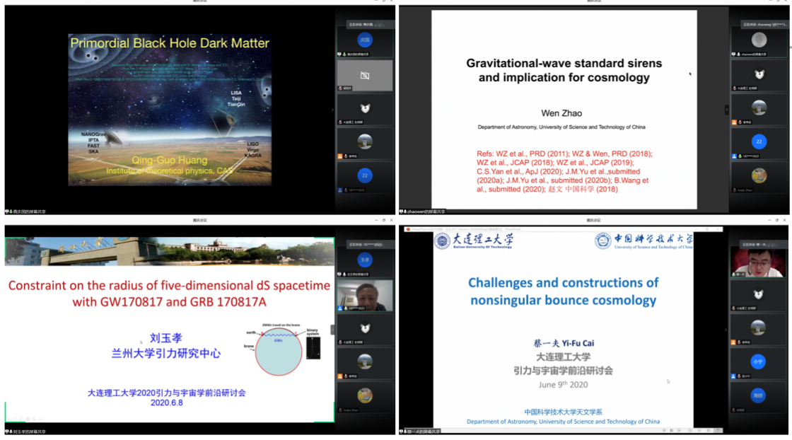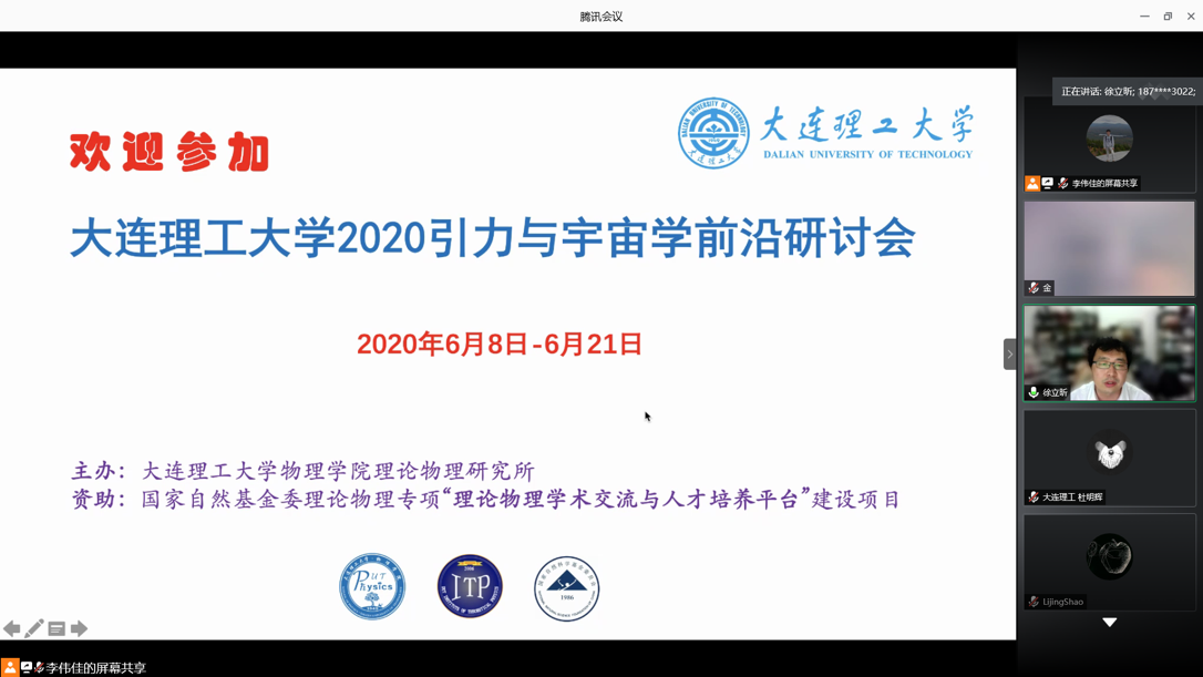 2020年6月8日-6月21日,由多宝网投理论物理研究所主办的“大连理工大学2020引力与宇宙学前沿研讨会”成功召开。本次会议受国家自然基金委理论物理专项“理论物理学术交流与人才培养平台建设项目”资助,组织者为大连理工大学徐立昕教授和李伟佳副教授。会议采用了“腾讯会议”进行线上学术交流,共有中科院及海内外50余所兄弟院校和科研院所的100余名引力与相对论领域的专家报名参会(峰值在线人数为160余人)。