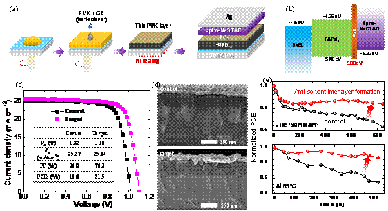 成果简介:这项技术的发展重点是实现高效、稳定的PSCs并探清其物理机制。目前,绝大多数高效稳定的PSCs都是基于多阳离子混合阴离子的组合物,其中甲基铵的热不稳定性和混合卤化物组分的相分离倾向严重限制了PSCs的长期稳定性。近日,博士后王敏焕在该领域取得突破性进展。首次提出了原位反溶剂界面PVK钝化技术,实现了基于完全无铯、无甲基铵和无溴钙钛矿组分(FAPbI3)的太阳电池,稳态效率达19.36%,且光热稳定性大幅提升。该成果将为高性能钙钛矿光电器件的研制和实用化提供理论依据和实验技术指导。以“Stable and Efficient Methylammonium, Cesium, and Bromide-free Perovskite Solar Cells by in-situ interlayer formation”为题,发表在《Advanced Functional Materials》上。论文第一作者为多宝网投博士后王敏焕,大连理工大学边继明教授、韩国成均馆大学Jin-Wook Lee教授和美国加州大学洛杉矶分校Yang Yang教授为共同通讯作者。该成果得到国家自然科学基金等项目资助。王敏焕于2020年6月博士毕业于大连理工大学微电子学院,现为边继明教授课题组博士后。博士期间荣获校学术之星、研究生国家奖学金(3次)、辽宁省优秀毕业生等多项奖励,在Advanced Materials, Nano Energy, ACS Applied Materials & Interfaces等材料能源领域国际期刊发表论文近20篇。一直从事钙钛矿光电材料与器件研究,并先后在本领域国际顶级科学家美国加州大学洛杉矶分校YangYang课题组和韩国成均馆大学N.G. Park课题组联合培养。