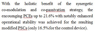 已证实提高结晶度、钝化晶界和界面缺陷对于提高钙钛矿太阳能电池(PSC)的功率转换效率(PCE)和稳定性至关重要。鉴于此,本成果提出了一种共调结晶和共钝化的协同策略,以同时提高结晶度并钝化基于FAPbI3的钙钛矿太阳能电池的晶界和表面缺陷。凭借增强的结晶度、减少的缺陷和陷阱位点以及减轻非辐射复合和抑制离子迁移的整体优势,所得改性钙钛矿太阳能电池实现了高达21.6%的效率。此外,该策略使器件在连续光照下具有显著增强的运行稳定性,在连续光照800小时后,仍保持初始PCE的84%以上。论文第一作者为多宝网投博士后王敏焕,大连理工大学边继明教授、化工学院史彦涛教授为共同通讯作者。该成果是王敏焕博士后上一篇(Advanced Functional Materials,31, 2007520 (2021)基础上取得的最新成果。该成果得到国家自然科学基金等项目资助。