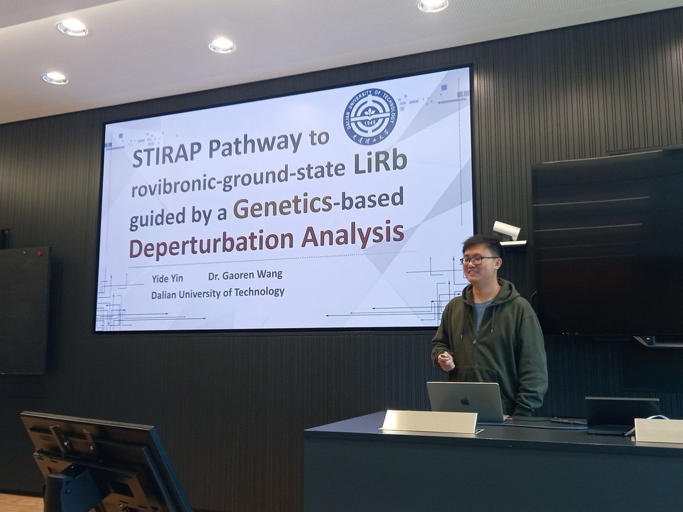 在此次访问期间,尹益德同学作了题为“STIRAP Pathway to rovibronic-ground-state LiRb guided by a Genetics-based Deperturbation Analysis”的学术报告。报告介绍了通过遗传算法分析并拟合自旋轨道耦合扰动下的光谱数据,并预测制备绝对振转基态超冷锂铷分子的受激拉曼绝热通道。来自该研究所的20余位成员听取了报告,并围绕算法细节及其在超冷分子制备中的应用前景展开了深入讨论。访问期间,尹益德参观了超冷钠钾分子实验室和铷原子实验室,深入了解了该领域的前沿动态。
