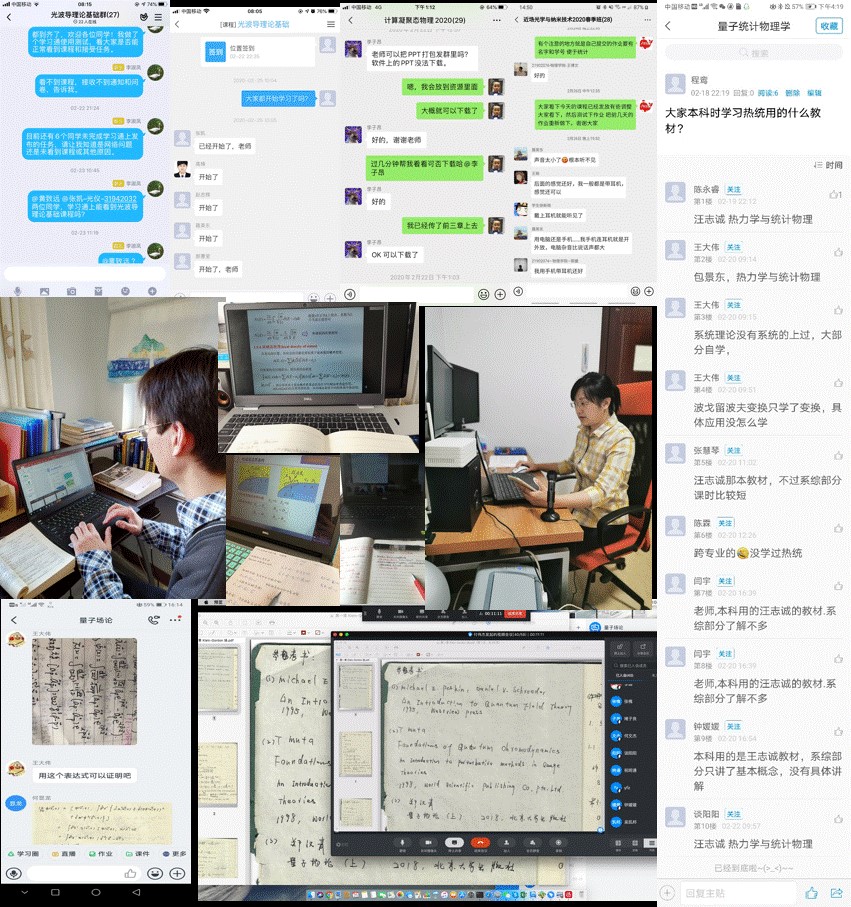物理学院师生协同联动,用实际行动投身战“疫”,停课不停学,积极探索开展线上教学模式,有效地确保了学院研究生教学标准不缩水、教学质量不降低。同时,通过线上教学,提高了学生自主学习能力和教师信息化教学水平。