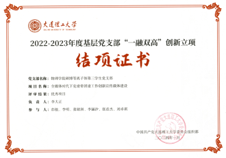 物理学院硕博等离子体第三学生党支部在2022-2023年度大连理工大学基层党支部“一融双高”建设创新立项验收工作中以“全媒体时代下党建带团建工作创新宣传载体建设”项目获评“优秀”。