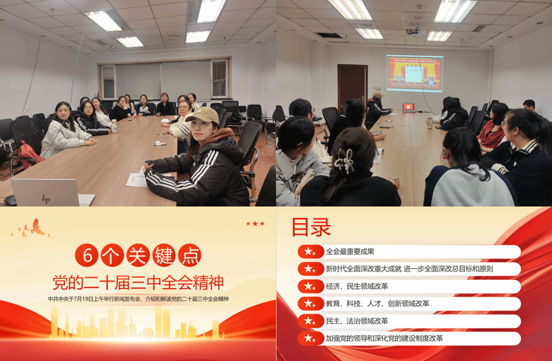 随后,赵博书记带领全体党员集中学习党的二十届三中全会精神,围绕全会的重要成果和深远意义进行了详细讲解。她指出,全会审议通过的《中共中央关于进一步全面深化改革、推进中国式现代化的决定》是新时代全面深化改革的纲领性文件,为未来发展指明了方向。赵博书记全面阐述了新时代全面深化改革取得的重大成就,以及进一步深化改革的总目标和基本原则,深刻启发了在场的每一位党员。她重点解读了经济和民生领域的改革举措,深入剖析了教育、科技、人才和创新领域的创新发展,这些领域的改革不仅是推动社会进步的重要动力,更是每位党员应当重点关注和深入思考的方向。此外,她还就民主与法治领域的改革进行了解读,强调加强党的领导和深化党的建设制度改革的必要性和紧迫性。全体党员共同观看了党的二十届三中全会相关视频。在观看过程中,大家专心致志,深刻体会到我国全面深化改革的坚定决心和宏伟蓝图,感受到改革发展的强大动力和历史意义。