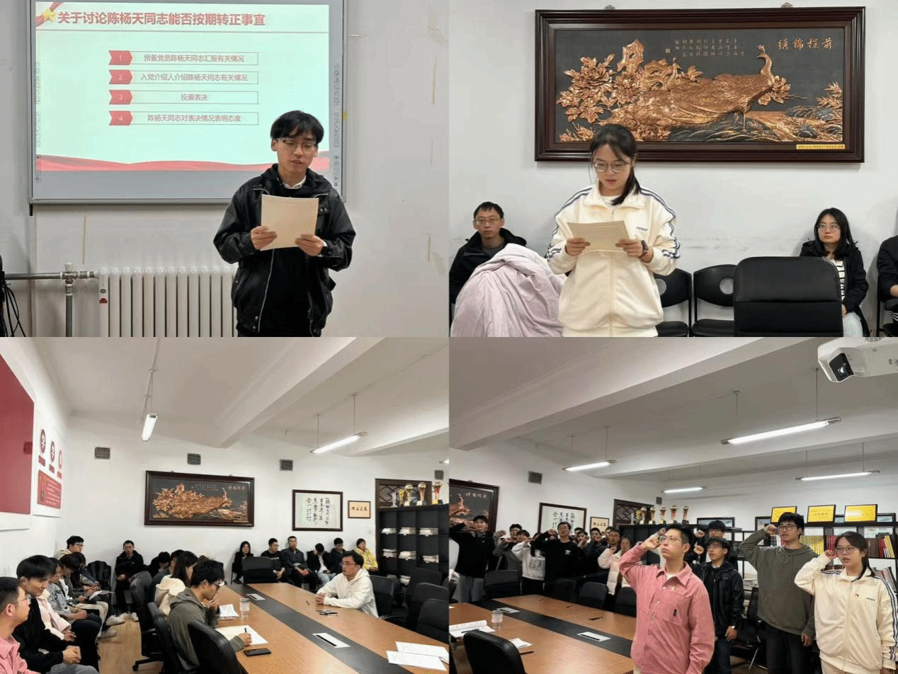 大会第二项,根据党支部发展党员计划,经征求党员、群众意见,支部委员会审查同意,召开预备党员转正大会,讨论关于陈杨天同志与田悦同志的转正事宜。首先由陈杨天同志与田悦同志宣读转正申请书,向大会汇报自己在预备期间的思想、学习、工作和生活情况,总结分析自己的优缺点,明确今后的发展方向,表明自己的入党决心。随后,入党介绍人分别就两名同志在预备期的表现发表了意见,并表示同意其按期转正。经过全体与会正式党员通过无记名投票表决,一致同意陈杨天同志与田悦同志按期转为中共正式党员。最后陈杨天同志与田悦同志对表决情况表明态度,全体党员在万佳彬同志的带领下进行入党宣誓。