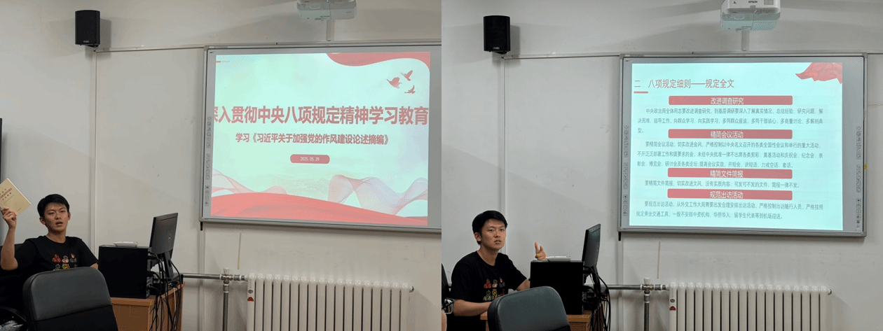 为推动深入贯彻中央八项规定精神学习教育走深走实,切实提升党员的政治素养和理论水平,增强党支部的凝聚力,物理学院硕博等离子体第三学生党支部于2025年5月29日在物理楼422室开展主题党日活动暨深入贯彻中央八项规定精神学习教育主题党课。会议内容主要包括讨论和表决预备党员的转正问题以及学习专题党课。会议由党支部书记高子豪同志主持,党支部全体党员参会。