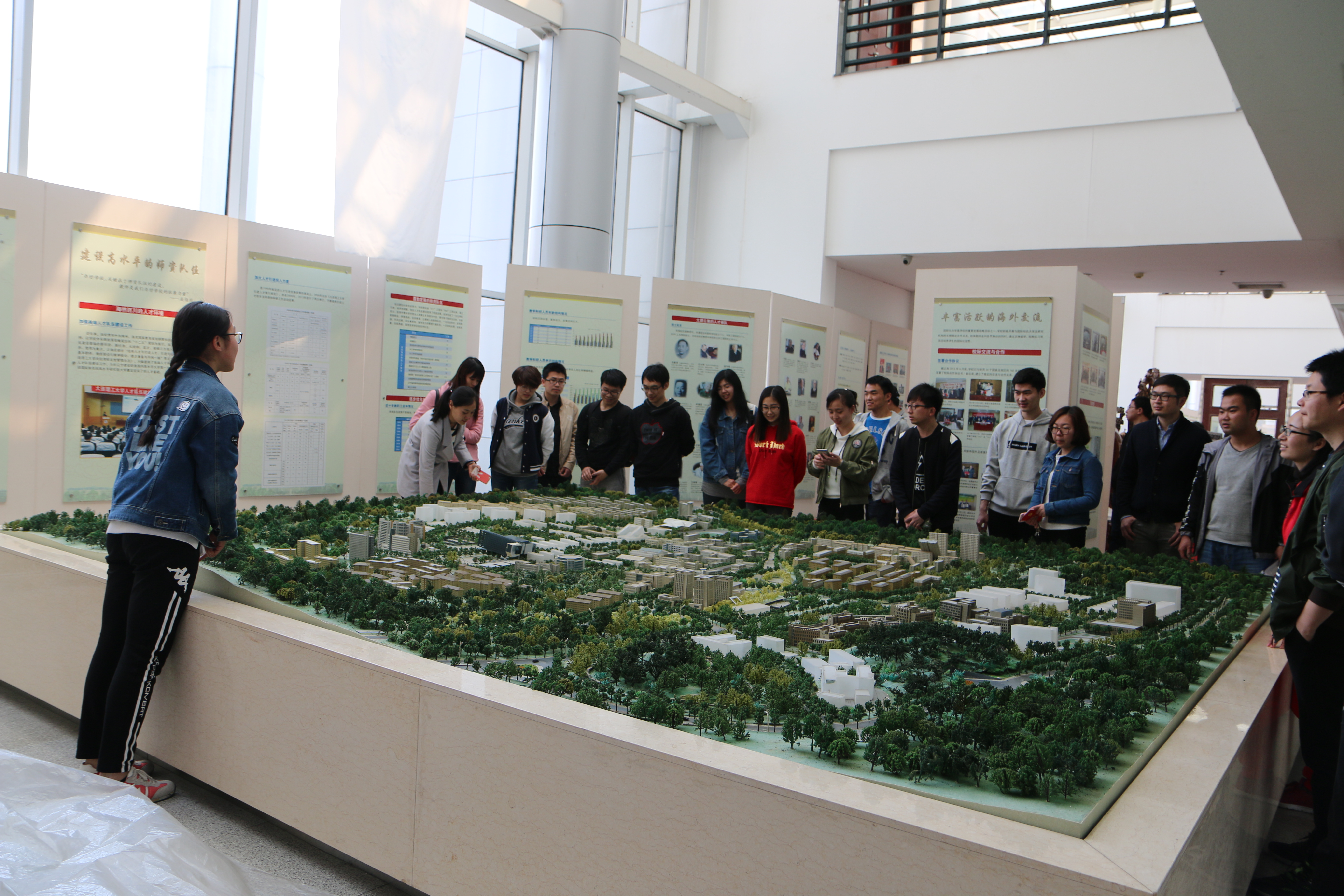 回顾了学校的历史,接踵而至的便是学校近年来取得的一系列辉煌成果的展示。讲解员从教学、科研、文体等方面所取得的成绩及代表人物得一系列解说,使支部成员感叹到学校不菲的整体实力与发展进步之快,作为大工人在此时此刻内心是骄傲着的。接着,讲解员带支部成员走进一些物品的展示区,屈老院长生前的办公及生活用品,学校教学所用的模具以及校友捐赠给学校的一些物品都一一展现在我们眼前。最后,讲解员带领全体人员来到校史馆展区的最后一部分——校貌实景展示区,“哎,大黑楼在那儿呢”,说话间,已有不少同志开始寻找各自的教研室及宿舍楼所在的位置了。
