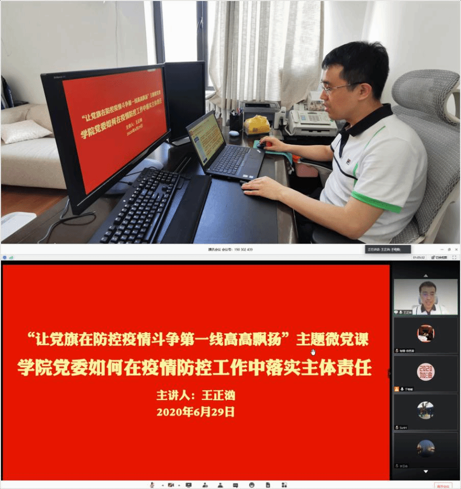 6月29日,物理学院党委书记王正汹以网络报告形式为全院师生党员上了一堂题为《学院党委如何在疫情防控工作中落实主体责任》的微党课。王正汹通过阐述“主体责任”概念和介绍《党委(党组)落实全面从严治党主体责任规定》中党组(党委)的责任内容,强调“学院党委落实疫情这一特殊时期的主体责任,就是要深入学习贯彻落实习近平总书记关于疫情防控工作重要讲话和指示精神和党中央关于疫情防控工作的决策部署”;通过对物理学院疫情防控工作的阶段性总结,向参与疫情防控工作的师生党员表达感谢,激励学院各支部各党员继续充分发挥基层党组织战斗堡垒作用和共产党员的先锋模范作用。