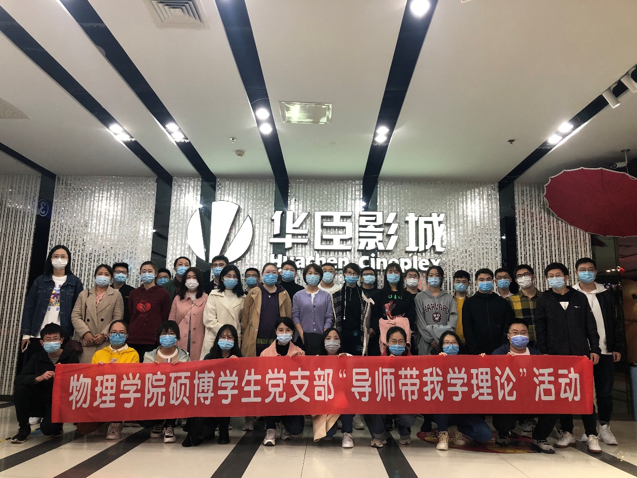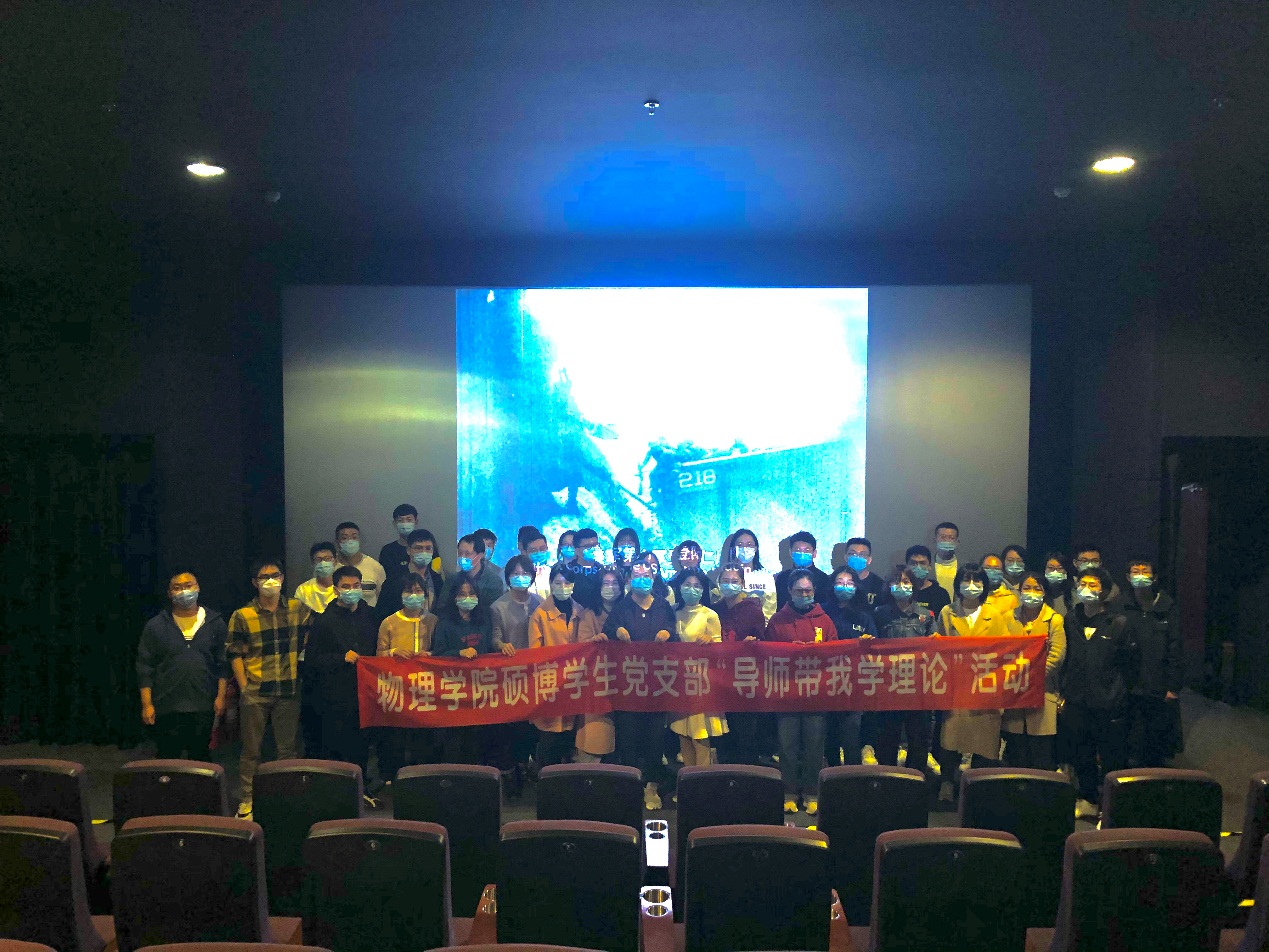 在举国上下隆重纪念中国人民志愿军抗美援朝出国作战70周年之际,为落实上级党组织安排部署,教育党员更深入了解抗美援朝相关知识,营造学习伟大抗美援朝精神的浓厚氛围,培养党员的历史观和责任感,更好地向抗美援朝英雄模范和战士致敬,物理学院硕博原子与生物学生党支部联合硕博理论物理学生党支部、硕博光学学生党支部结合“导师带我学理论”的契机,于2020年10月27日组织支部党员和发展对象走进电影院观看电影《金刚川》,并邀请了原子与分子物理专业研究生导师韩永昌教授和柴硕副教授来参加指导此次活动。