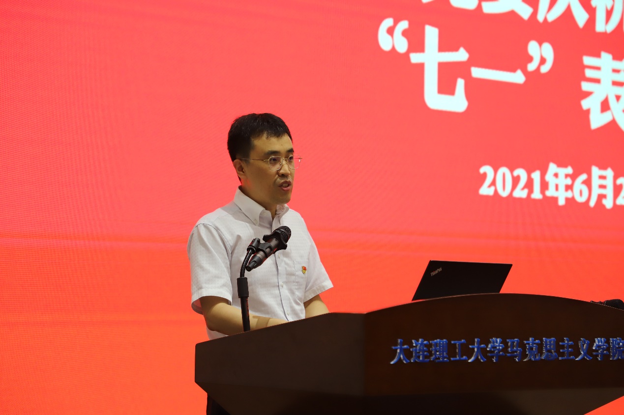 学院党委书记王正汹发表讲话,总结近年来学院党建工作的成绩和亮点,向获表彰的集体和个人致以祝贺与感谢,向学院全体党支部、全体党员提出“使命光荣,任重道远”的三点要求,号召全院师生“心怀百年路、启航新征程”。