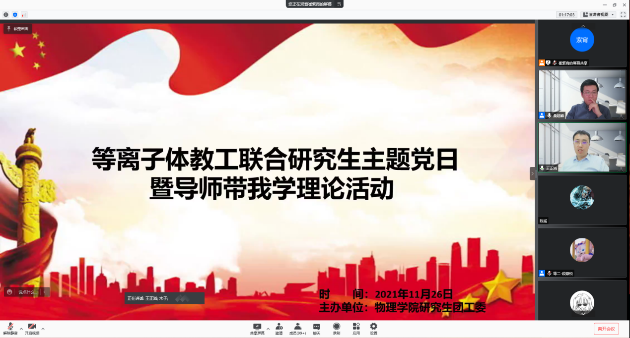 为响应学院党委关于加强深入学习党的十九届六中全会精神要求,发挥基层党支部宣传群众职能。同时为及时了解并解决疫情期间研究生遇到问题,2021年11月26日,物理学院等离子体物理教工和硕博学生党支部通过腾讯会议开展了以学习党的十九届六中全会精神和解决疫情“封校”期间问题的联合主题党日活动。等离子体物理教工党支部书记桑超峰教授讲解了党的十九届六中全会的主要内容并和相关精神,三名等离子体学生党支部书记对疫情期间研究生心理、科研等方面存在的问题进行反馈,物理学院党委书记王正汹教授、副院长高飞教授等对疫情封校后同学们反映的所遇到的问题予以解答并提出应对方法。活动受到老师同学积极响应,共有187人参会,其中老师25人,学生162人。