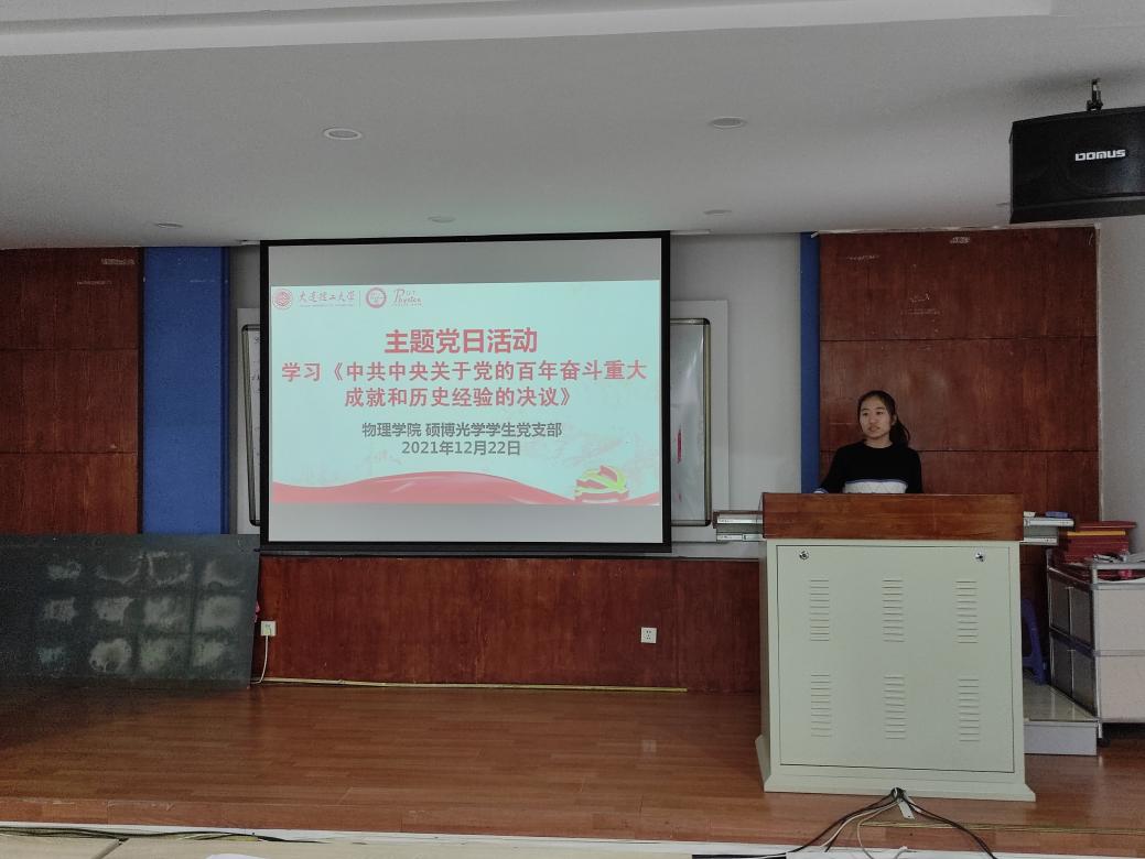 党的十九届六中全会,是在建党百年之际、在“两个一百年”奋斗目标历史交汇点上召开的重要会议,全会审议通过了《中共中央关于党的百年奋斗重大成就和历史经验的决议》,发出新时代中国共产党人牢记初心使命、坚持和发展中国特色社会主义的政治宣言。为深入学习贯彻党的十九届六中全会精神,深刻领会《决议》精神,强化支部全体党员的政治责任感和历史使命感,物理学院硕博光学学生党支部于2021年12月22日在物理楼322会议室开展“学习《中共中央关于党的百年奋斗重大成就和历史经验的决议》”主题党日活动,支部全体党员参与活动。