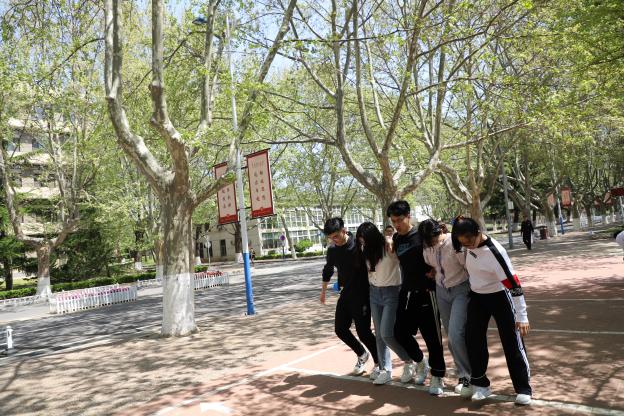 比赛的最后一项为“五人六足”,在规定路段内所用时间最少的队伍获胜。绳子绑住的不只是脚,更是并肩作战的心,“一二一二”,随着大家口中整齐划一的口号,终点也越来越近。