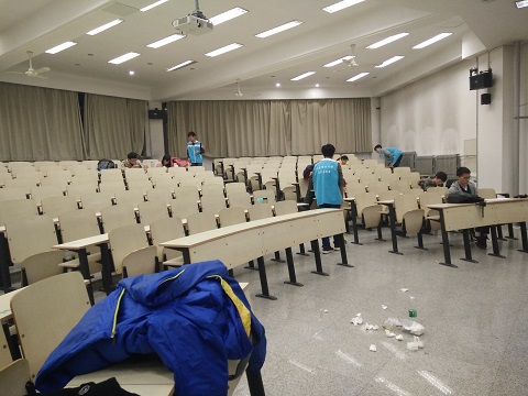 活动从晚九点半开始。参与活动的21人分成两组,带上清洁工具,分别清理了综一西侧和东侧的共计十八间教室。其中一组采取了“集中力量一起干”的方式,从一楼开始一层层向上进发,全组集中清理;另一组则采取了小组责任制,每小组负责一层。各小组分工明确,清理抽屉、打扫地板、整理讲台,同学们各司其职,认真负责地开展工作,将废纸、食物残渣等垃圾一一清理,并且细心地将讲台、黑板擦拭干净。