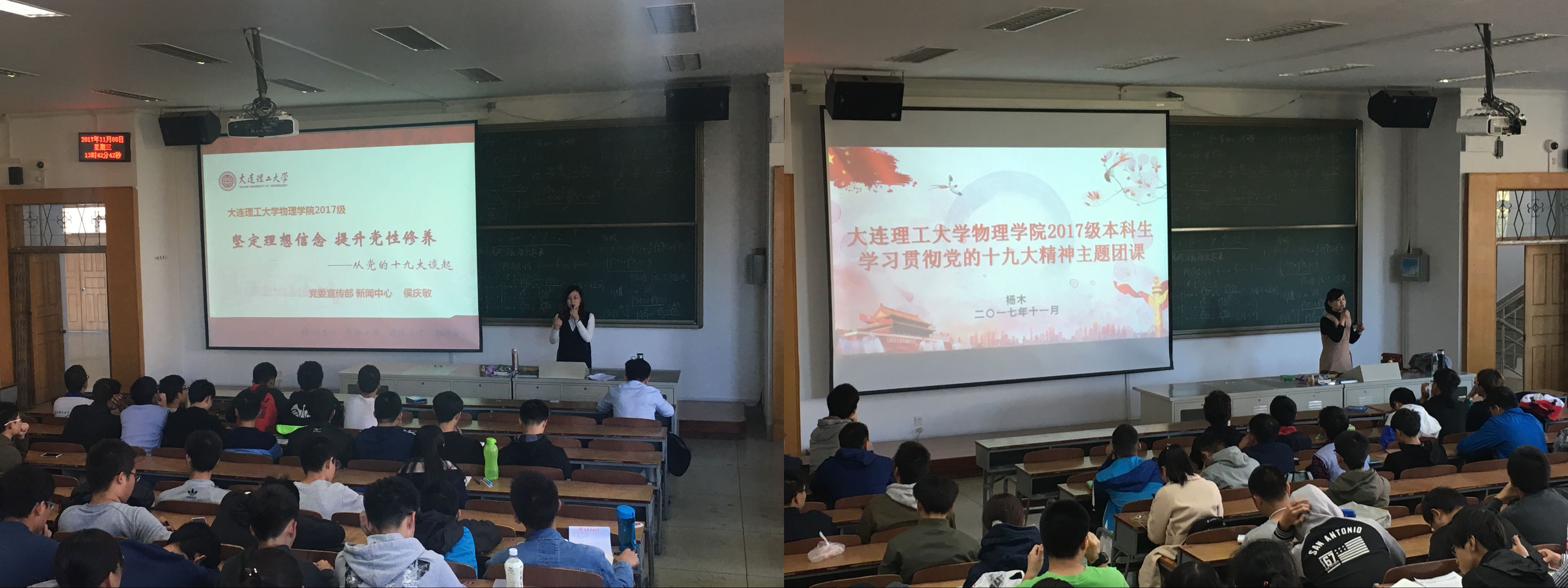 其中,物理学院党委副书记兼副院长17级辅导员杨木老师,为大一同学召开了“学习贯彻党的十九大精神”主题团课,对十九大精神进行深入剖析和解读,并针对青年学生做出努力学习科学文化知识、加强理论学习的要求,并邀请了党委宣传部新闻中心侯庆敏老师做有关“坚定理想信念,提升党性修养”的专题报告,使同学们从思想上、行动上更为坚定地团结在以习近平同志为核心的党中央周围,不忘初心、砥砺前行。