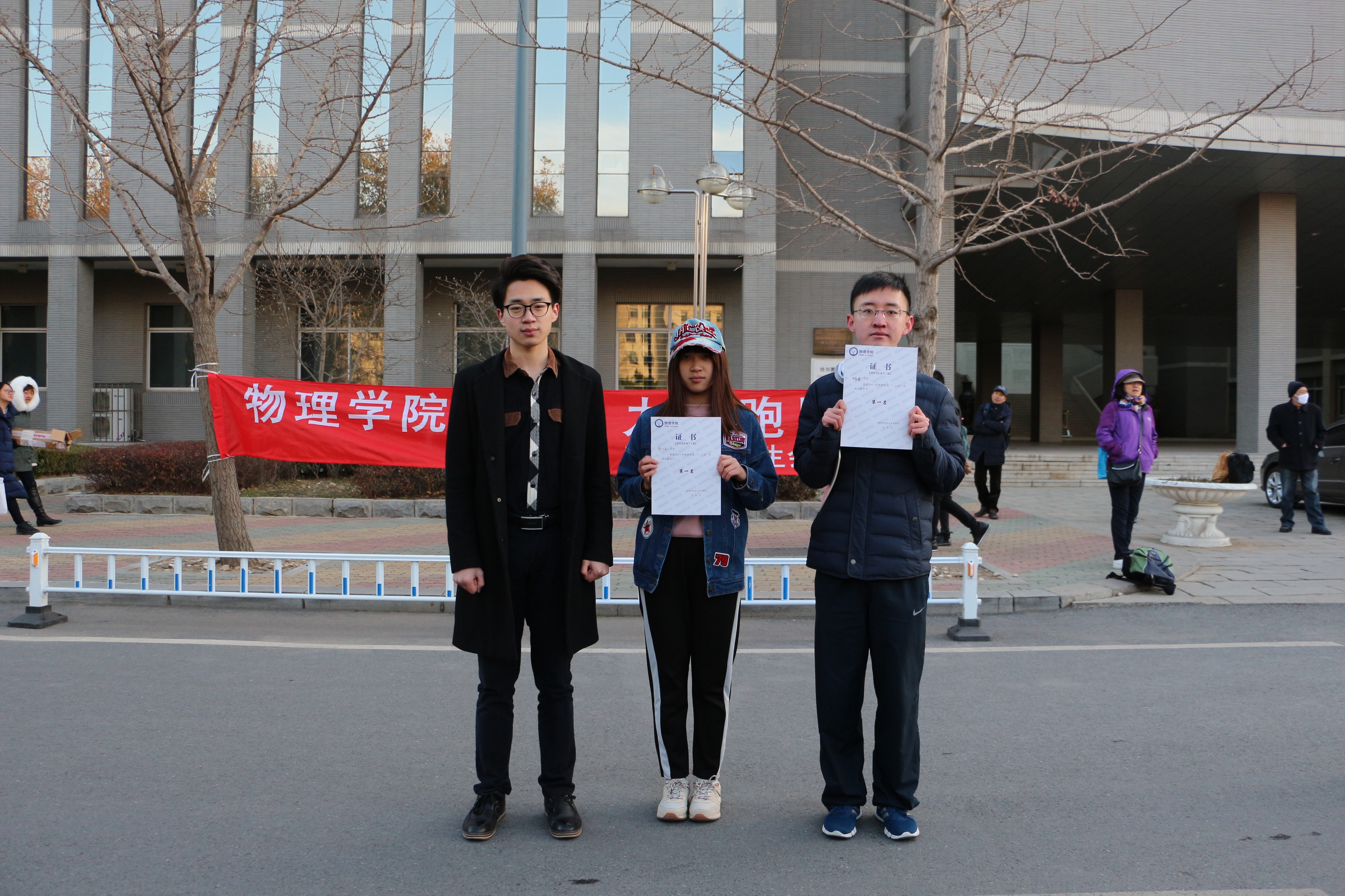 虽然天气很冷,但同学们都热情高涨,早早就来到场地等待比赛的开始。本次比赛采取接力形式,每班派出五位同学参赛。经过紧张的赛前热身与准备,两点整比赛正式开始。第一棒由女生率先上场,每个人都神采奕奕,全然不惧路程漫长。第二棒以后是各班的男生,他们全力以赴,努力为班级赢得荣誉。尽管路程很长,天气十分寒冷,但参加比赛的每一位同学都出色的完成了自己的任务,展现出物理人顽强拼搏的精神与坚韧不拔的意志。现场同学们也纷纷为比赛选手加油助威,并由各部门工作者为选手们提供热水与温暖的食物。