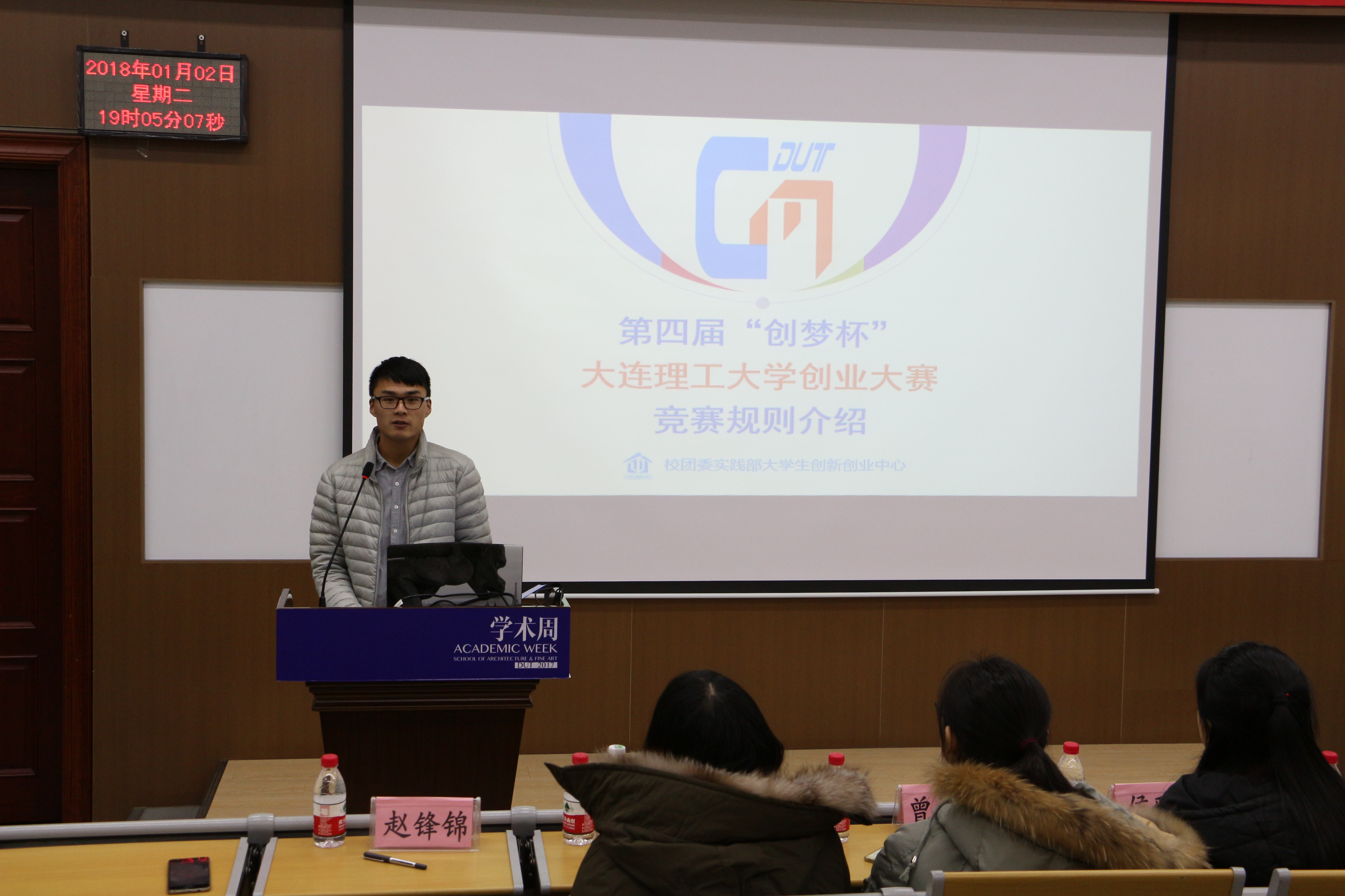 2018年1月2日晚6:30,由物理学院和建筑与艺术学院联合举办的创梦杯宣讲会在第二教学馆309室举行,出席本次活动的嘉宾有校团委实践部大学生创新创业中心副主任赵锋锦,物理学院科技实践部部长周滔,物理学院科技实践部副部长乔家鑫,以及来自建筑与艺术学院和建艺科创部的马骁尧、曾译莹、侯雅洁等。