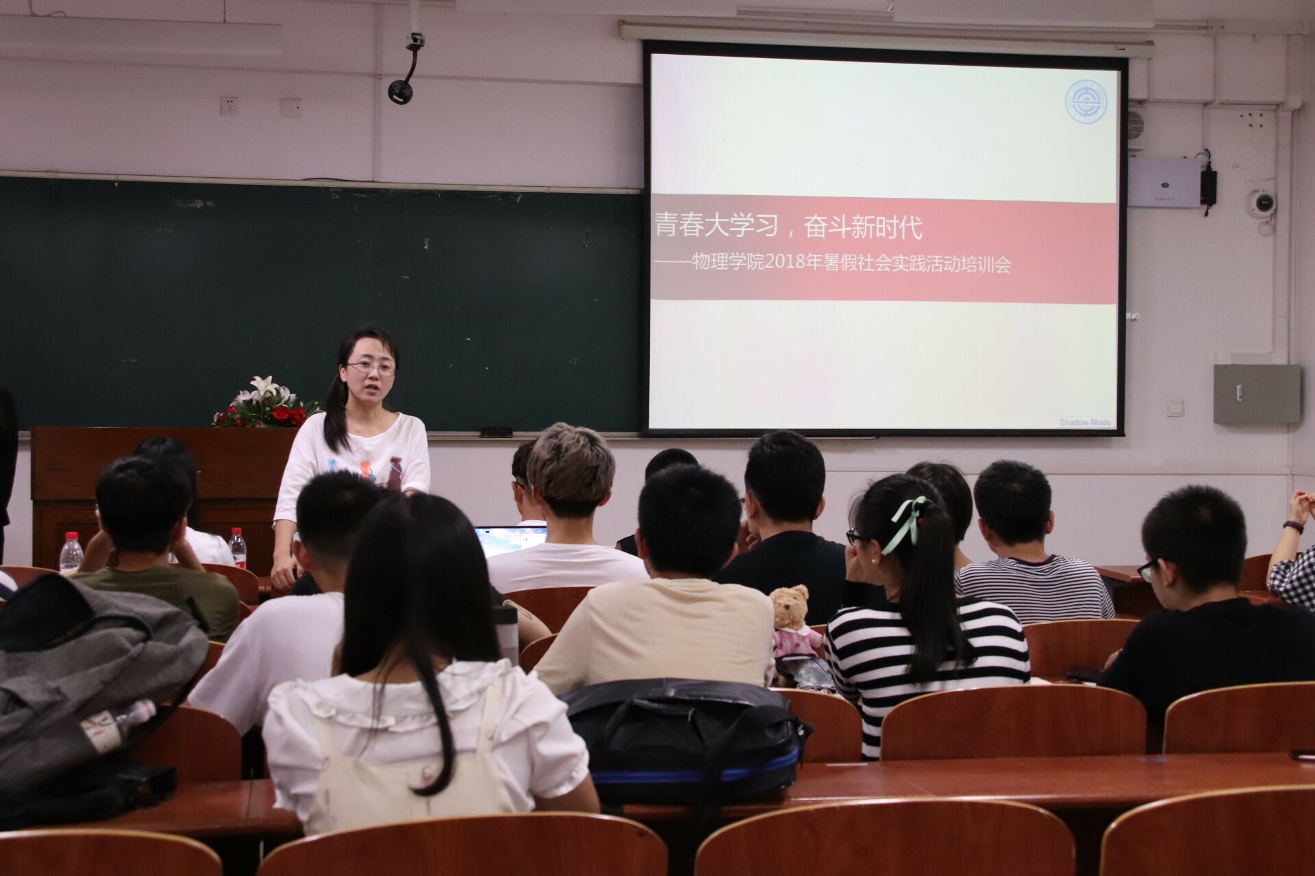 7月3日下午六点半,物理学院团学社实践部在综合教学二号楼a103开展以“青春大学习,奋斗新时代”为主题的暑期社会实践宣讲活动。本次宣讲会出席的嘉宾有物理学院团委书记兼2015级辅导员纪丹红,物理学院寒假实践校一等奖团队成员吕响,团委常务副书记刘禹君,团委实践部部长苏子祺。