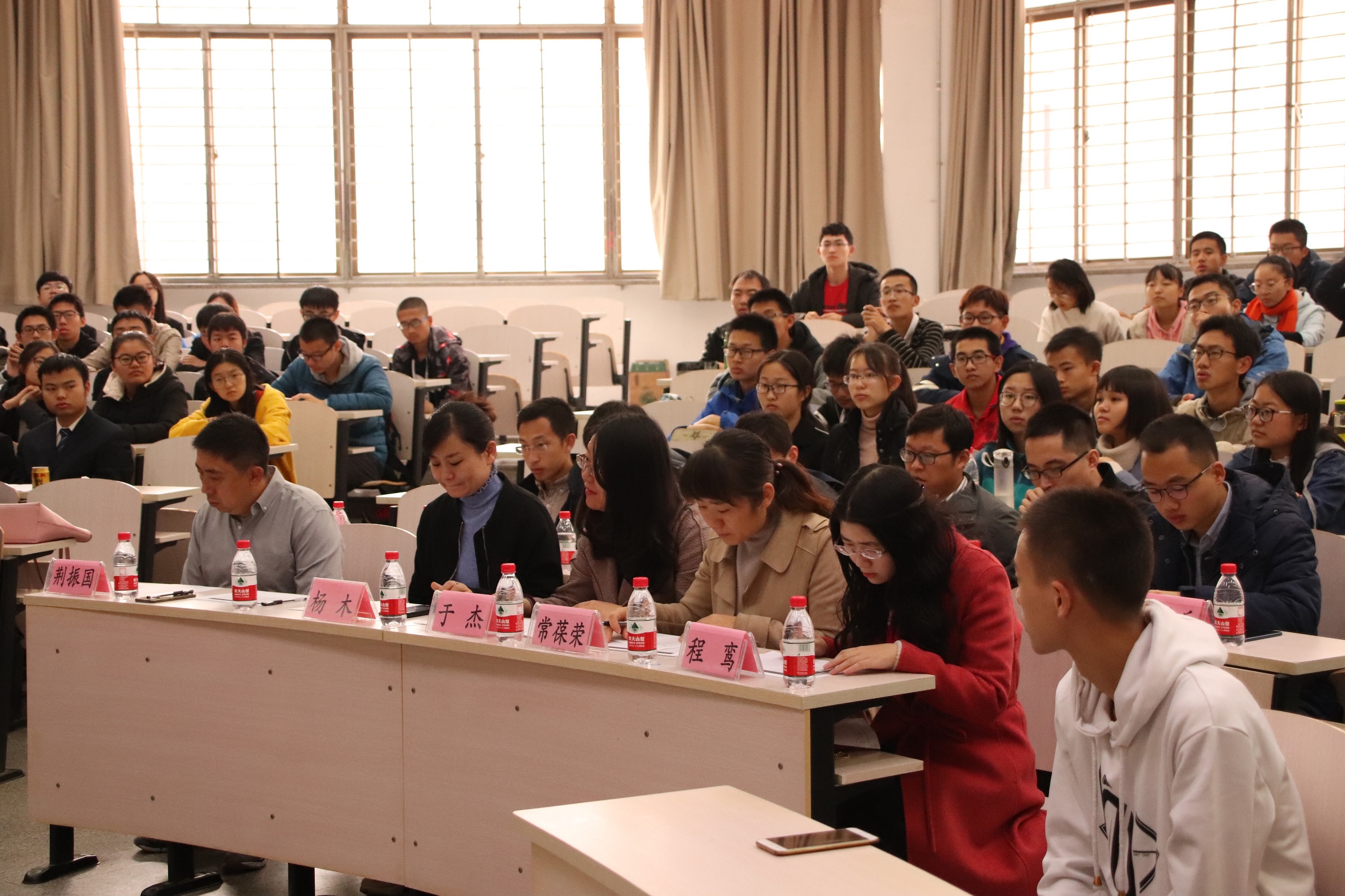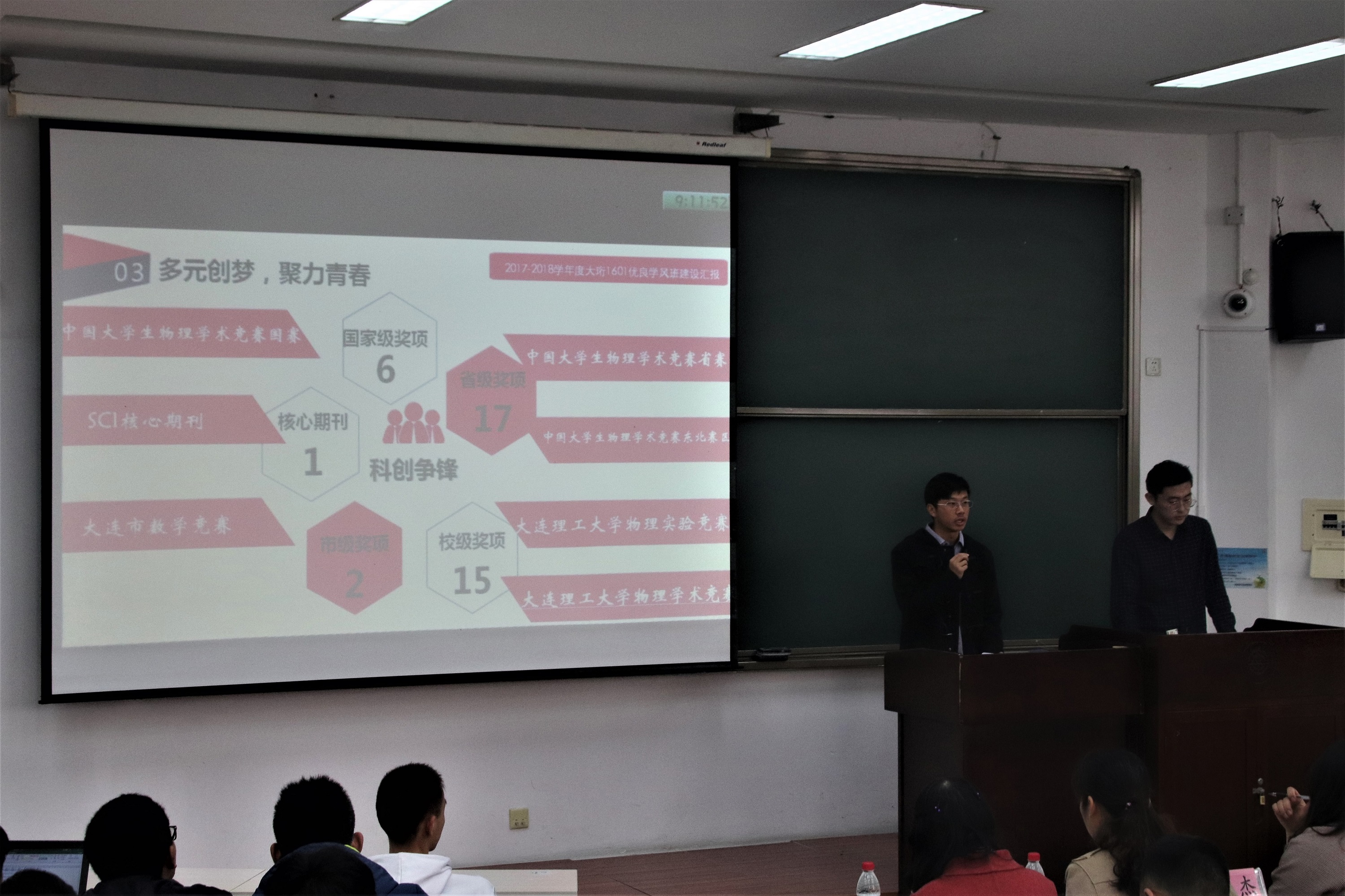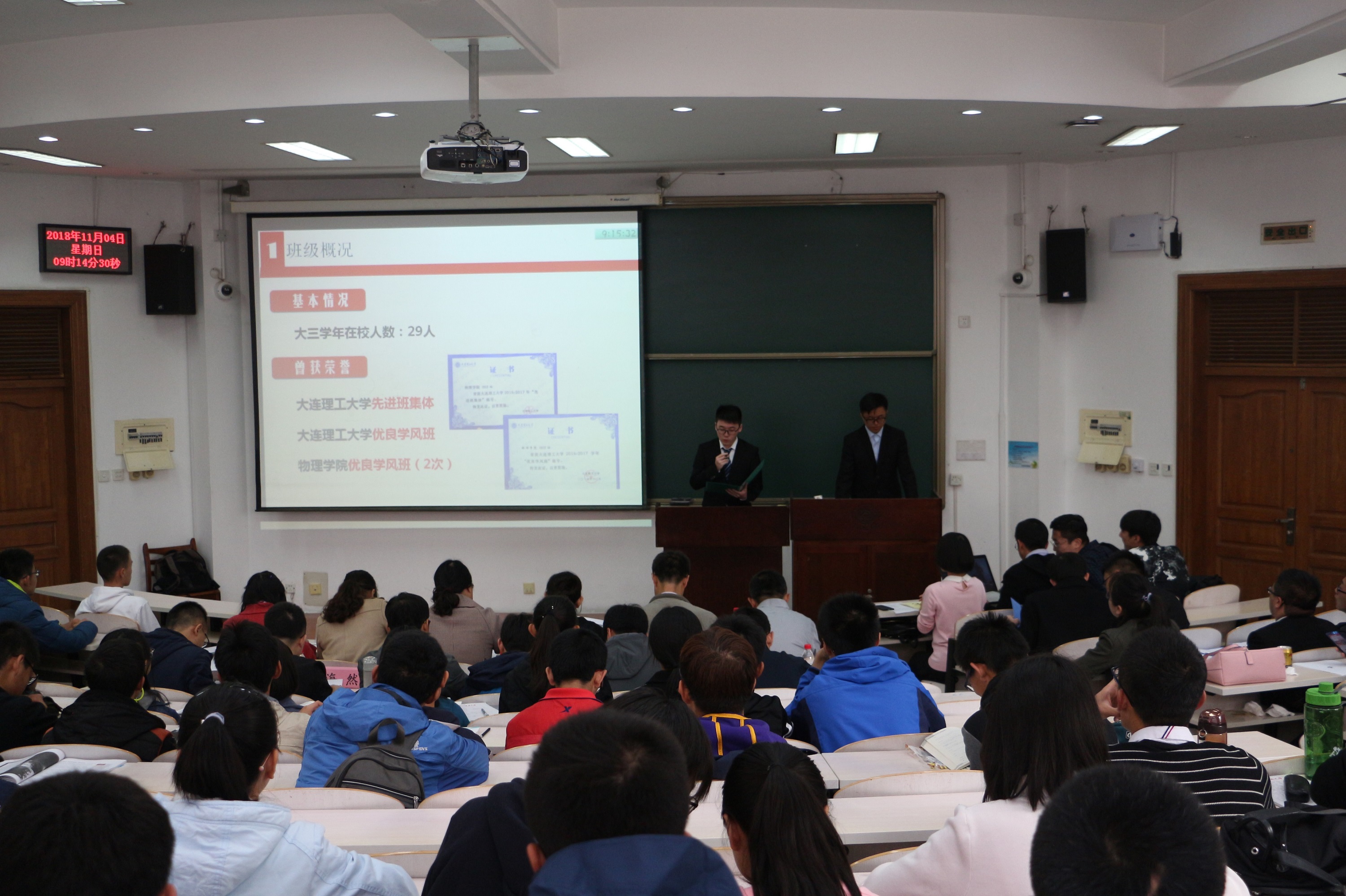 答辩环节中,先由班级代表整体介绍班级体,再由评委老师提问。各个班级以自班的学习规划及成绩情况介绍为主。其中,历届大珩班平均成绩较为突出。物大珩1501班共29人,其中21人保研,1人出国,7人考研。物理这一学年也拥有零挂科班级,物1603班一考零挂科,班级尖子人数多,班级互帮互助蔚然成风。此外,各班级结合还自身特点积极开创团建活动。有的班级集体开展志愿活动,在学有余力时积极投入到社会实践中。有的班级认真参加科创项目,获得突出成绩,如大珩1601班,至今共斩获6向国家级科创奖项,各类奖学金累计36200元。各班在精神文明,社会工作,文体活动,,社会实践等方面权衡发展,也取得优异的成绩。