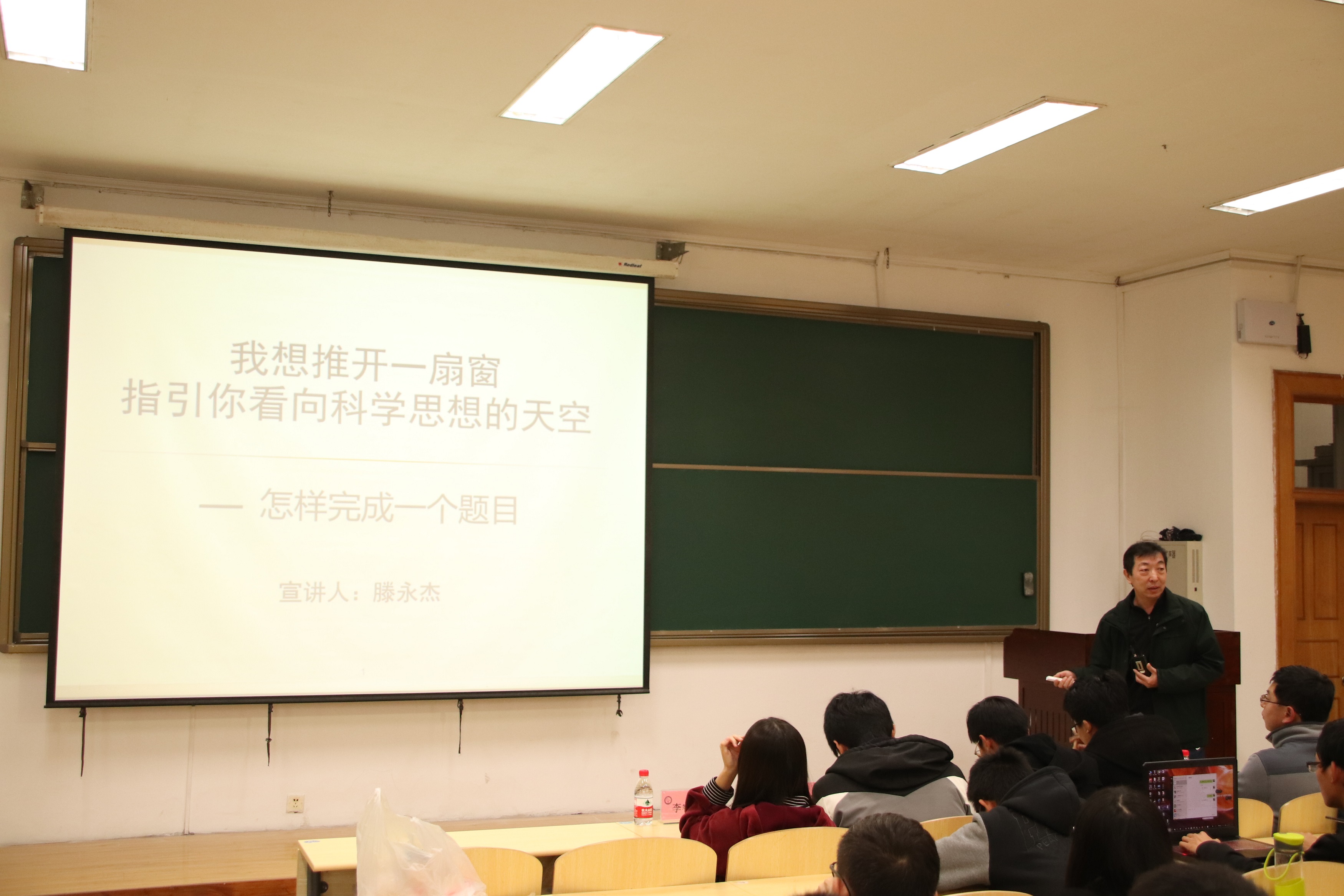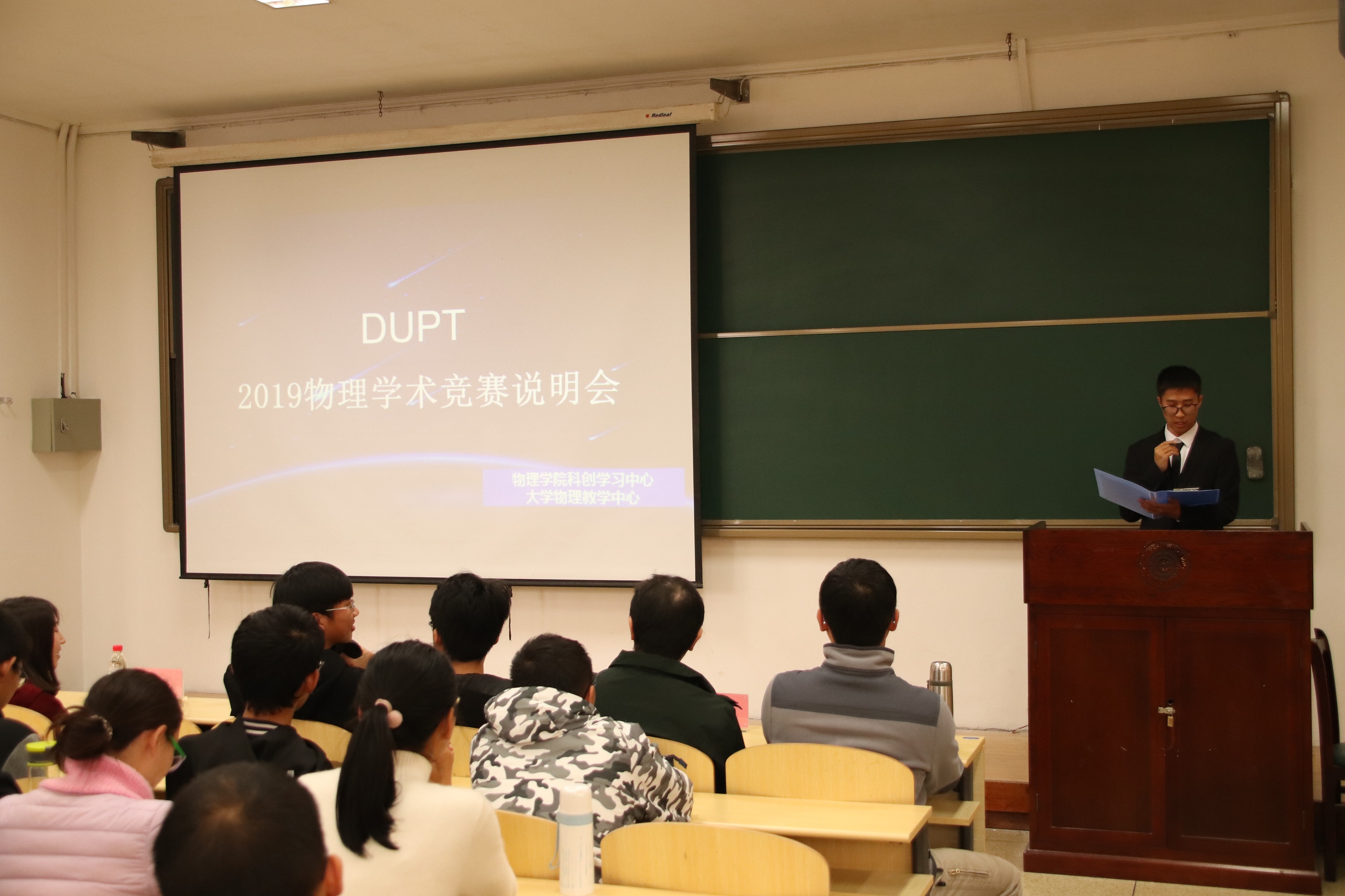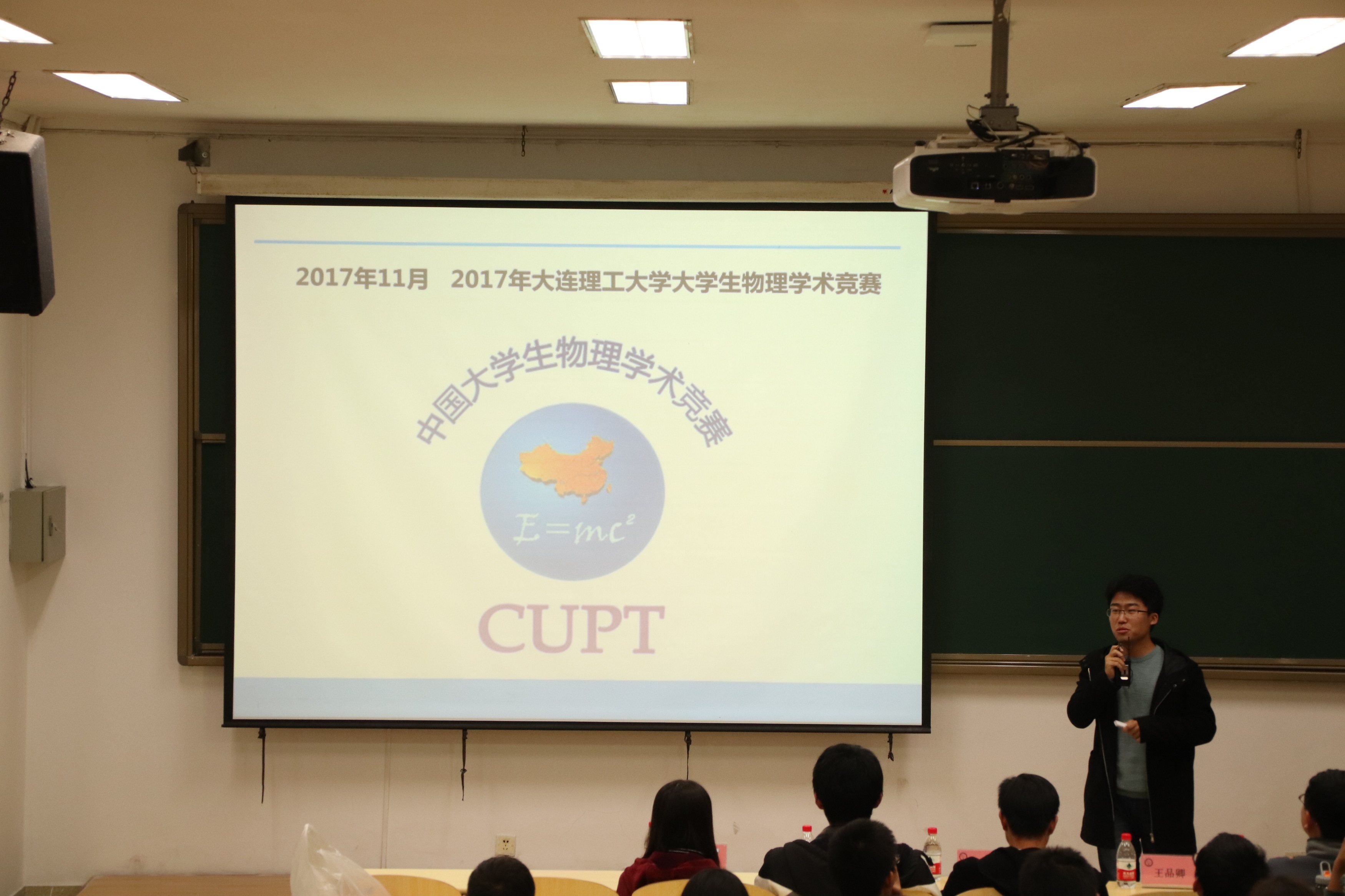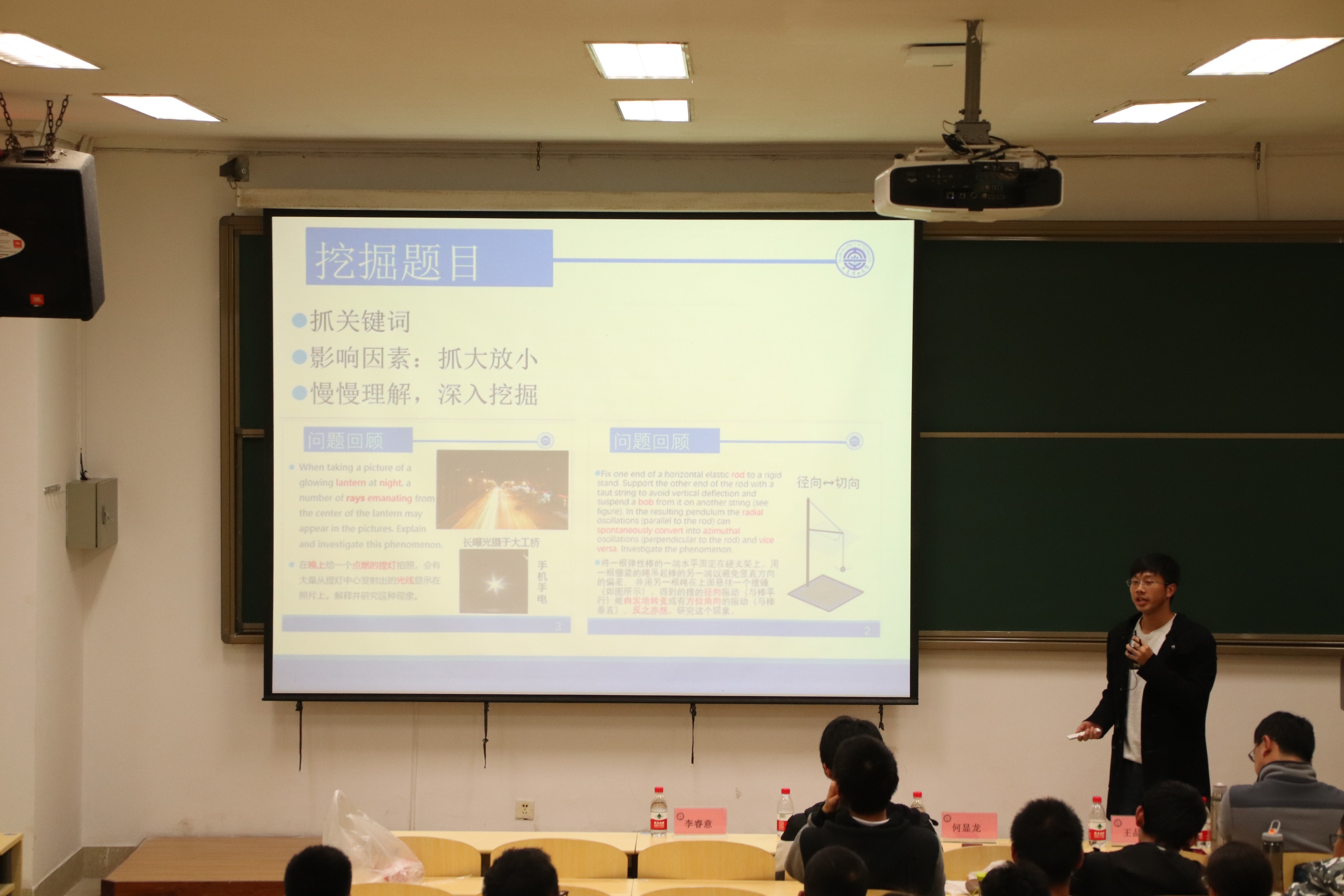 宣讲会之初,白洪亮老师率先上台,针对于物理学术竞赛的背景进行详细的介绍。在发言中,他表明CUPT是以学术讨论、团队对抗为形式的物理学竞赛,让选手们对竞赛有一个更深刻的认识。此外,他还介绍相关的各个物理学术竞赛、相应的网络平台、学校的投入、物理学术竞赛的发展历程以及历年取得的成绩。尤其是提及去年第九届中国大学生物理学术竞赛大工代表队取得特等奖,提及他们的付出与努力时,白洪亮老师不禁热泪盈眶。接着,滕永杰老师向同学们讲解关于怎样完成竞赛题目。他认为同学们应该通过理解题意,实验先行,理论推导等步骤完成对竞赛题目进行解答,同时也强调一些比赛细节及作品原创的重要性。