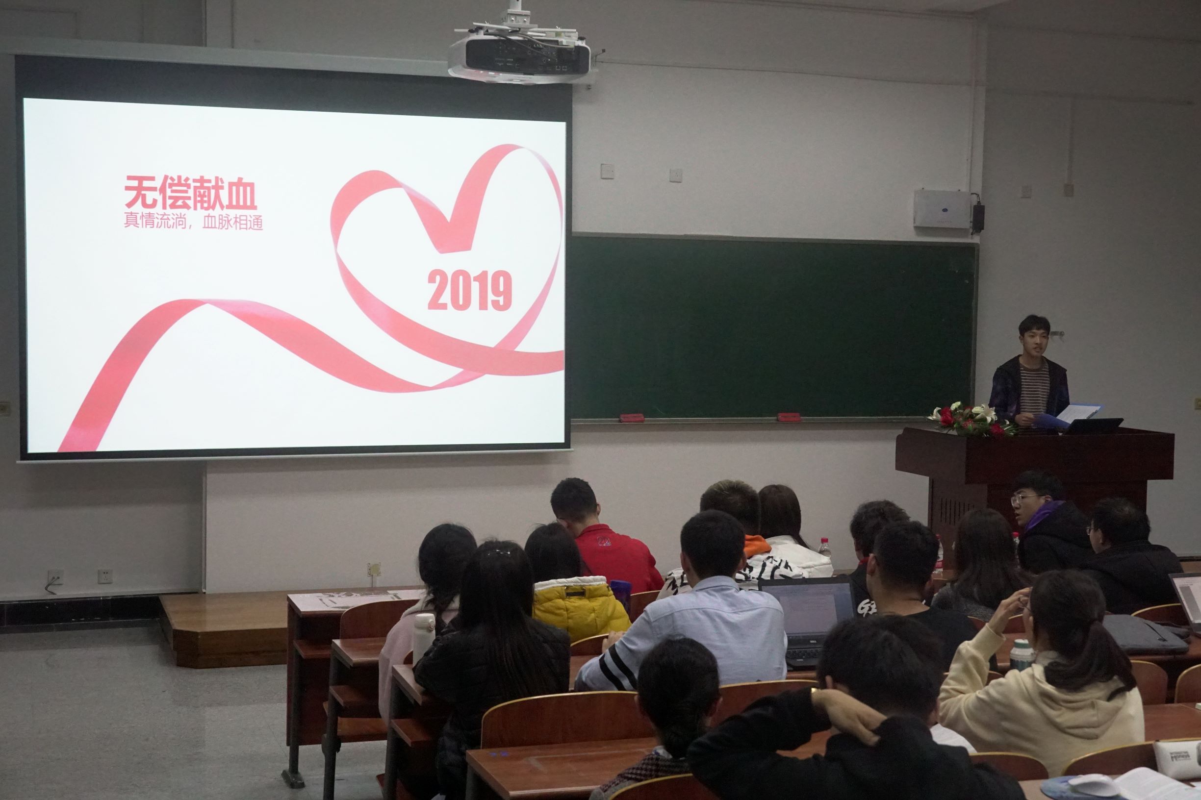 大会在团歌声中拉开序幕。首先,王栋梁分别从献血简介、献血过程、报名细节、问题解答四个方面进行“无偿献血”宣讲。他重点讲解献血的好处、条件、过程,指出适当献血不但无害,还可提高血液健康水平,预防部分疾病。通过王栋梁学长的讲解,我们领悟到献血是救人一命的高尚品行,在助人为乐、与人为善的同时,也使自己的精神得到净化,心灵得到慰藉,工作与生活更加充实。做好事者以德施善,在帮助别人的同时实际上也是在帮助自己。