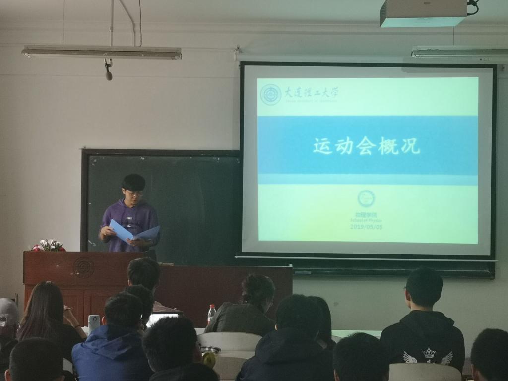 在大会的开始阶段,学生会主席边于进行发言。在发言中,边于为到场的运动员们介绍物理学院为迎接2019年春季运动会所做的准备以及运动会期间的具体安排,丰富运动员们对运动会的认知。在边于的发言结束后,物理学院本次春季运动会的运动员代表杜佳兴带领现场的运动员们进行宣誓,这次宣誓活动将大会现场的气氛推上又一个高潮,宣誓环节使物理学院运动员们的斗志与热情进一步提升,对接下来的春季运动会充满了期待。在宣誓结束后,物理学院团委书记纪丹红对本次大会进行总结,纪丹红书记指出,物理学院虽是小院,但在接下来的春季运动会中也应全力以赴,赛出自信,赛出物理人的风采。在大会的结束阶段,纪丹红书记对物理学院的运动员们进行热情的鼓励,并表达对运动健儿们在本次春季运动会中精彩表现的期许,大幅度增强到场运动员们对即将到来的运动会的信心。大会于2019年5月5日下午13时整圆满结束。
