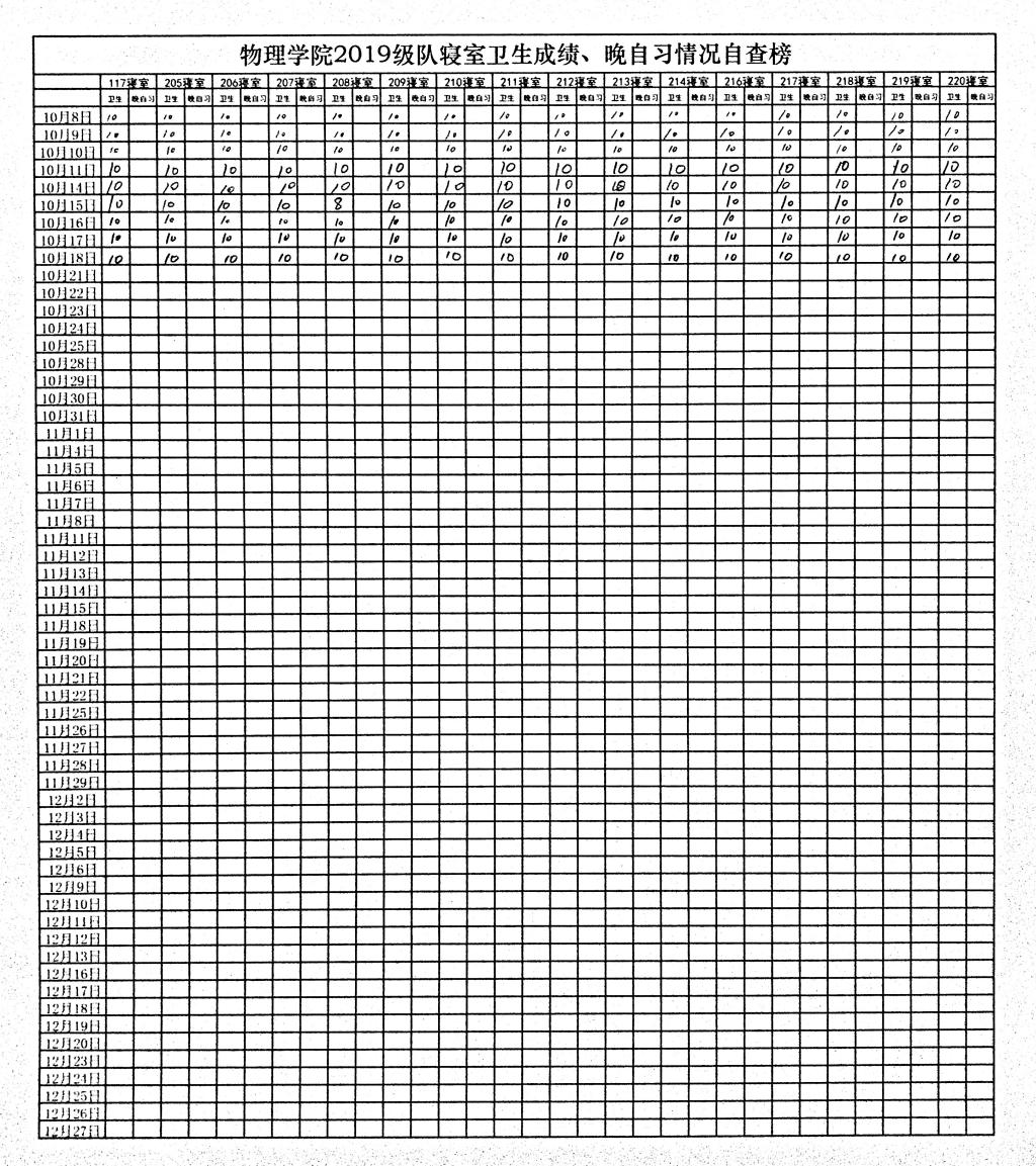 2019年10月21日早7点,物理学院大一级队辅导员纪丹红一如既往地来到西山生活区29舍的楼下。我院想通过打扫卫生的特色早操,避免卫生问题、身体问题等的发生,而制度的落实,离不开辅导员纪丹红和级队委员们的辛勤工作。目前,以打造更好的寝室环境为目的,大一级队已进行早操查寝9次,该扣分处也绝不手软。