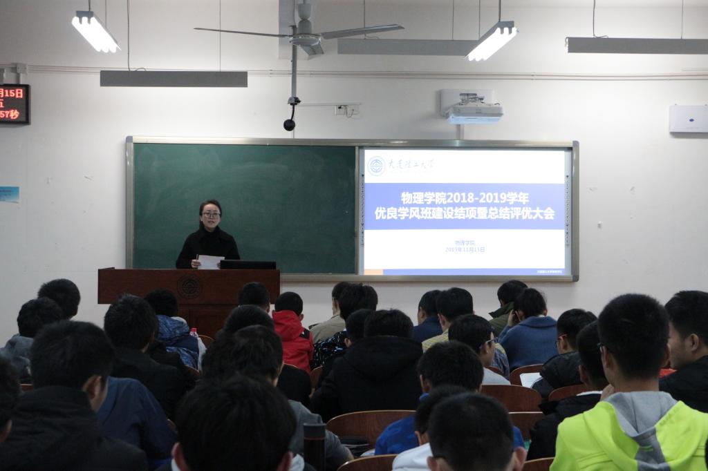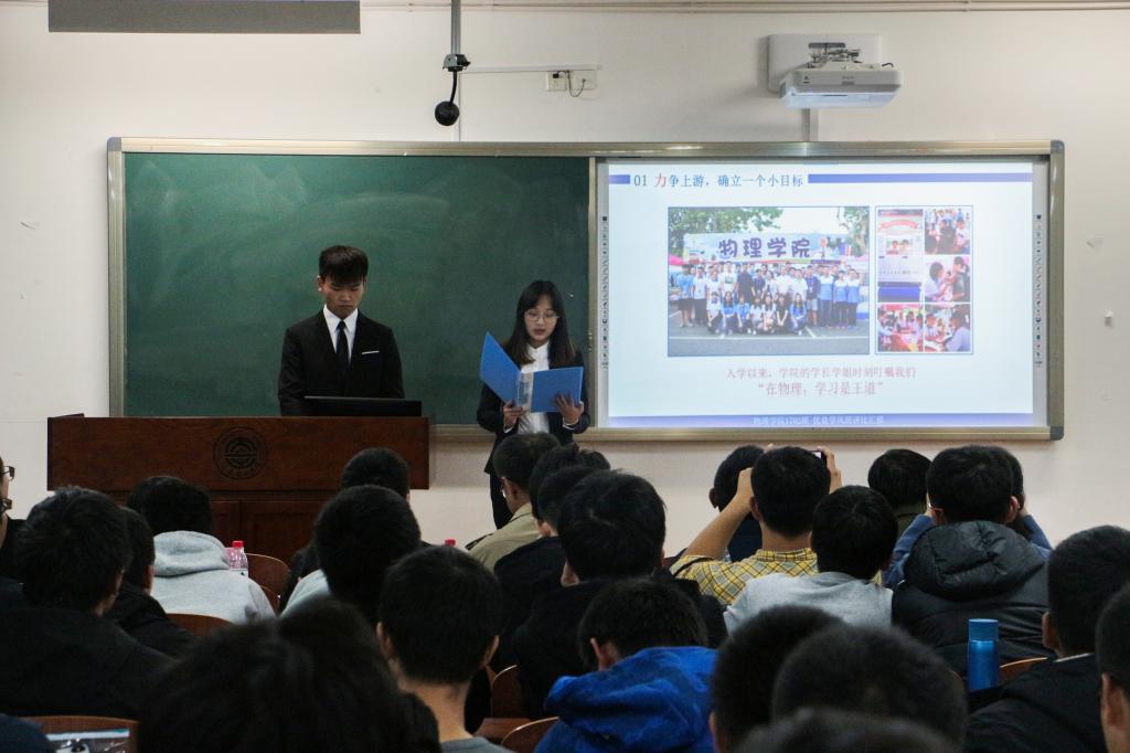 参与本次评优大会的班级有物理1601、大珩1601、物理1701,物理1702,物理1703,物大珩1701、物应1801和物大珩1801。在纪丹红宣布评比大会正式开始后,八个班集体的答辩选手依次上台开始答辩。学习是物理学院永恒的主题,物理学子对待学习永远心怀着一份热忱之心,其中不乏以班级为单位学习、以寝室为单位学习,成立学习小组、一帮一学习等模式,但以班级为单位印刷学习资料和开展学霸讲堂等方式让人心生敬佩。除了学习,各班同学的课余生活也丰富多彩。如物理1701的答辩选手展示出班集体优异的社会实践成果,向观众分享他们共同练习2400米长跑的快乐;而物理1702的答辩选手展示的是他们实行“无手机课堂”模式,定期组织月考带来的成绩提升。现场的评委老师就展示的内容与答辩选手进行深入探讨,如物理1702选手在说明他们实行的“无手机课堂”模式时,评委老师对这一方法的合理性提出质疑,认为使用手机可能有助于及时记录课堂内容,答辩选手随即补充他们在每节课上课前都会找代课老师拷贝课件。在答辩结束后,评委老师根据班级学习风气,现场展示效果等指标得出评分,并公示评比结果:物大珩1801当选为物理学院优良学风标兵班;物1702、物大珩1601、物大珩1701当选为物理学院优良学风班。