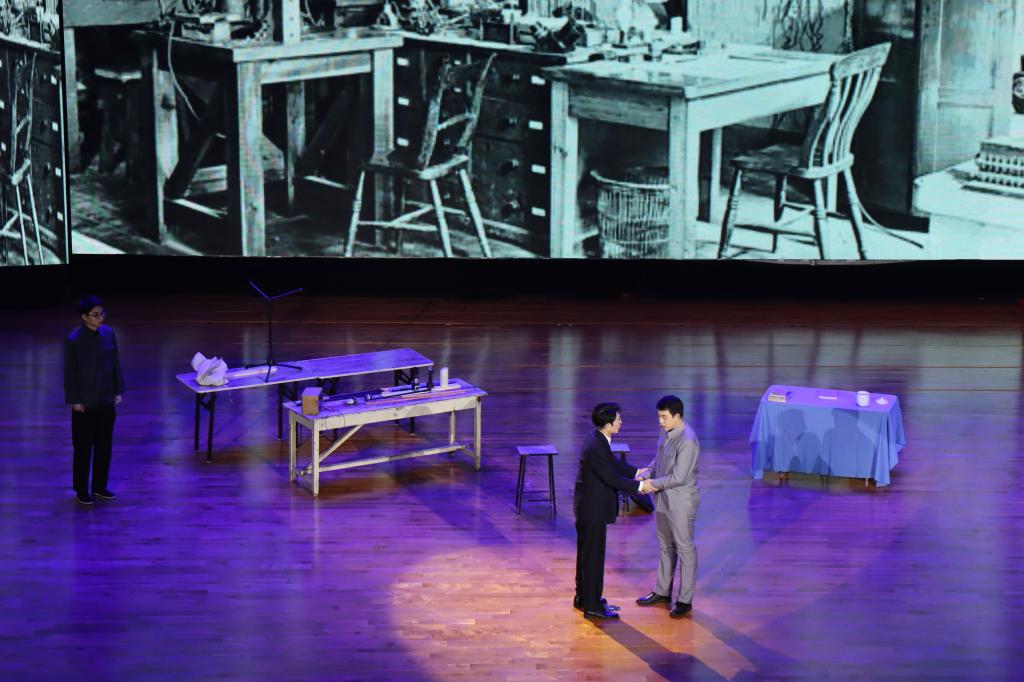 随着幕布缓缓落下,现场掌声雷动。物理学院的学子在短短几分钟内用精湛深入的演技真实地还原了王大珩先生带领大家艰苦拼搏的岁月。那不仅仅代表着一段艰苦奋斗的岁月,更是一位科学伟人对国家对民族所做的最大奉献。台上,是物理学院话剧演员所表演出的淋漓尽致的呐喊;台下,是观众们身临其境、深入戏中的切身体会。王大珩先生带给我们的不仅仅是一份沉甸甸的爱国情,更是“功名身世外,心事一杯中”的坚定信念!物理学子的精彩表演正是对这份爱国情的坚守与传递,同时也表达了物理学子坚定奋勇向前,为国家和民族奉献力量的坚定信念。