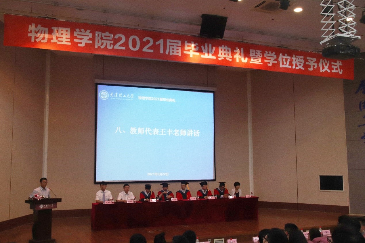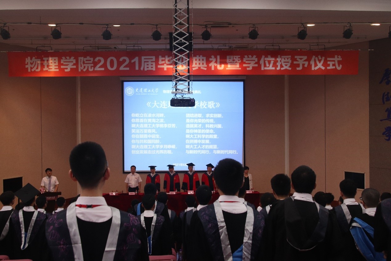 夏季逾至,又逢毕业季。物理学院2021届毕业生即将离开大工,开启新的旅程。2021年6月22日上午9时,物理学院2021届毕业典礼暨学位授予仪式在研教楼报告厅成功举行。出席的嘉宾有物理学院院长赵纪军教授、党委书记王正汹教授、副院长陈茂笃教授、副院长于长水教授、副院长高飞教授、党委副书记兼副院长周福良老师、党委副书记兼副院长于艳敏老师、学生工作办公室主任纪丹红老师、研究生辅导员张弛老师。此外,本次典礼也面向本科生思政班主任、专业班主任发出邀请。物1703班思政班主任赫铭老师、物1701班思政班主任邬霞老师、物大珩1701班思政班主任应兆升老师、物1702班专业班主任副教授王丰老师、物1703班专业班主任闫慧杰老师参与本次物理学院的毕业典礼。2021届本科毕业生辅导员唐健璐老师担任主持人。