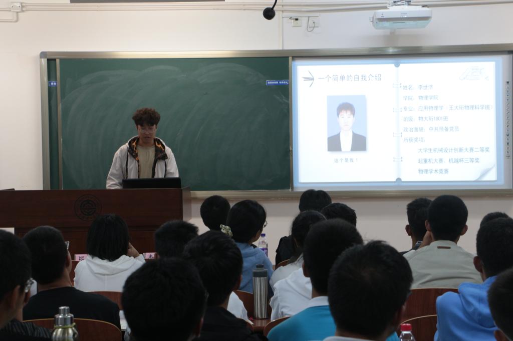 2021年10月8日晚18:30,2021-2022学年物理学院新老生交流会于综合教学2号楼A305室顺利举办。科创学习部志愿者魏思佳担任本次活动主持人,物大珩1801班刘政和、陈昱萌、李世济、毕研晨和石航睿五位同学分别从班级学习、学生工作、科创竞赛、出国留学和校园生活五个方面分享自己的心得体会。