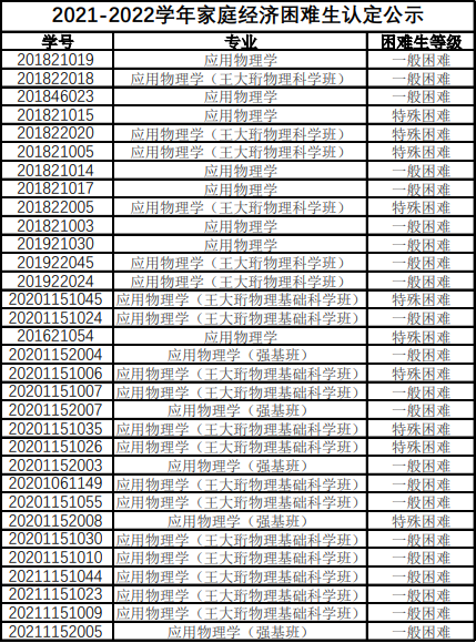 物理学院2021-2022学年家庭经济困难生认定结果公示