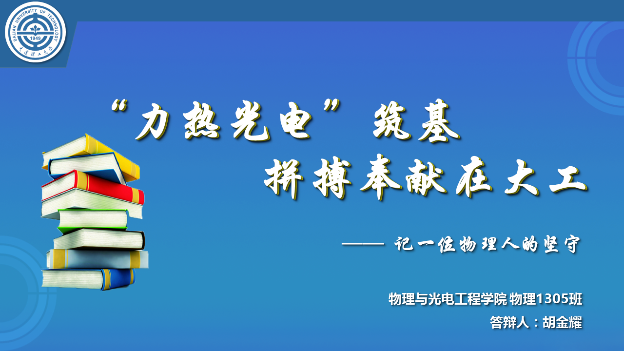 我是物理学院2013级光电信息科学与工程专业的胡金耀。很荣幸参与高额奖学金答辩。我汇报的主题是“力热光电”筑基,拼搏奉献在大工。今天,我以一名物理人的身份,汇报我的大学故事。
