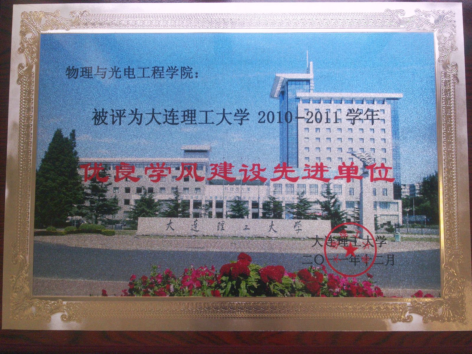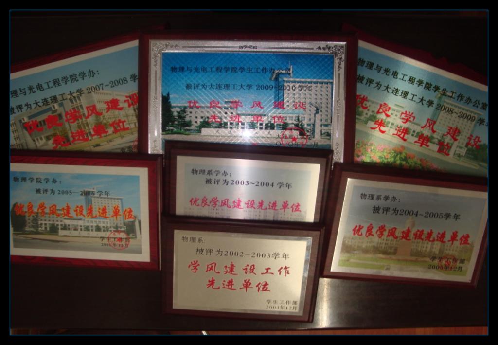 2011年12月,物理与光电工程学院荣获大连理工大学2010-2011“学年优良学风建设先进单位”荣誉称号,于近9年中第8次获此殊荣。